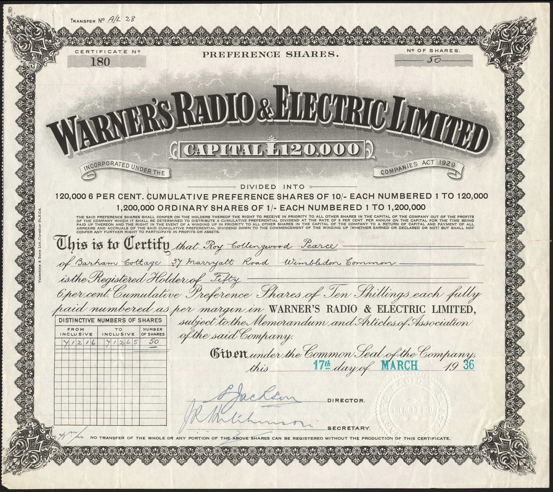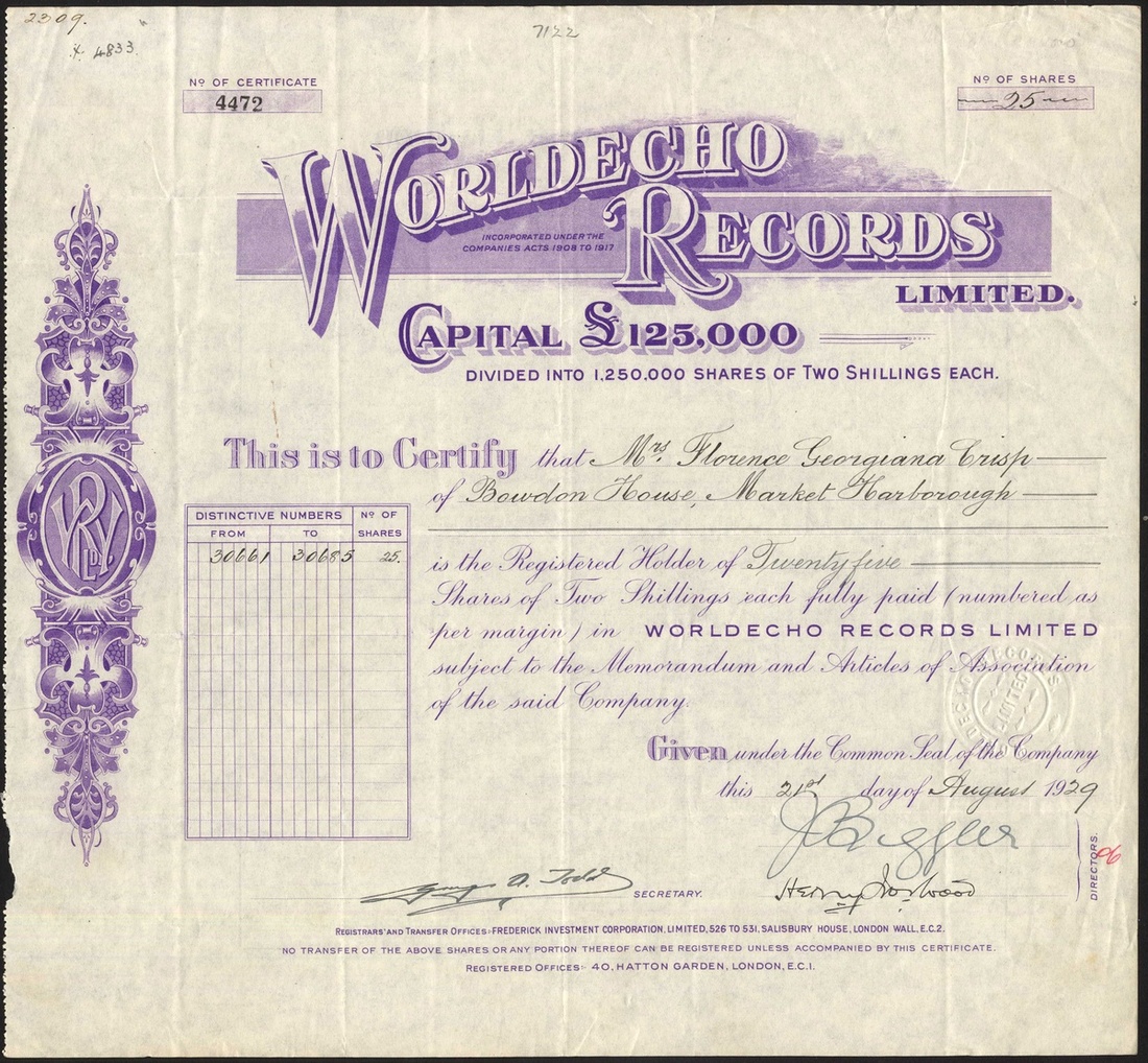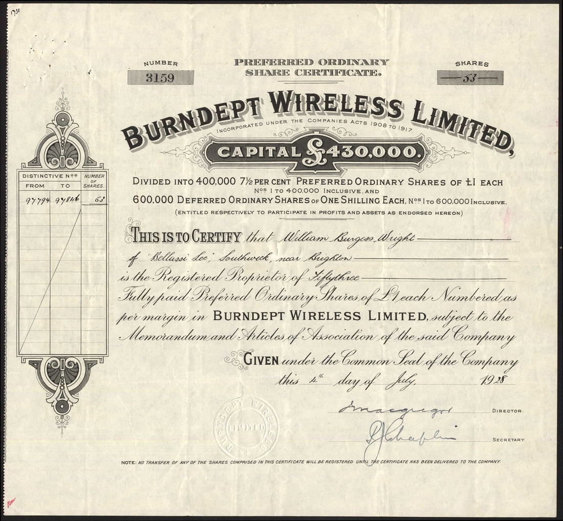 Radio and Gramophones: A small accumulation comprising Burndept Wireless Ltd., 1925-28, 5 examples; Warners Radio & Electric Ltd., 1936; Worldecho Records Ltd., 1929; Victoria Gramophones Ltd., 1929; Electramonic Co. Ltd., 1928; Electramonic Co. (1930) Ltd., 1930; Aeonic Radio Ltd., 1929, 3 examples; Vincent Manufacturing Co. Ltd., 1932; Electrical & Radio Products Ltd., 1930 and Electrical & Radio Products (1931) Ltd., 1932, 3 examples. Mixed condition but many VF (18).