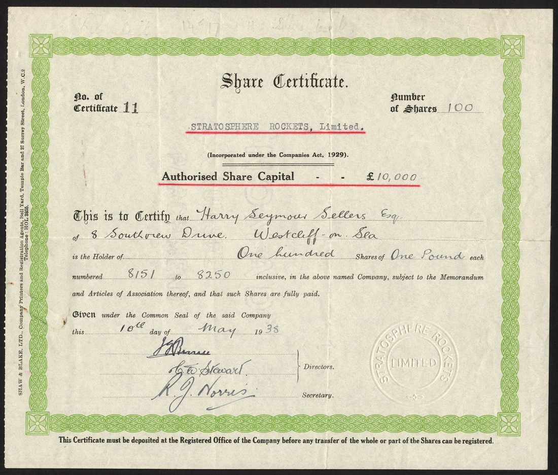 Stratosphere Rockets Limited, £1 shares, 19[38], #11. green and black. There was a race to put men and aircraft at the outside of the atmosphere during the 1930's. At first balloons took men to the stratosphere in 1931 and the following few years by rocket. No information available o this particular company. VF.