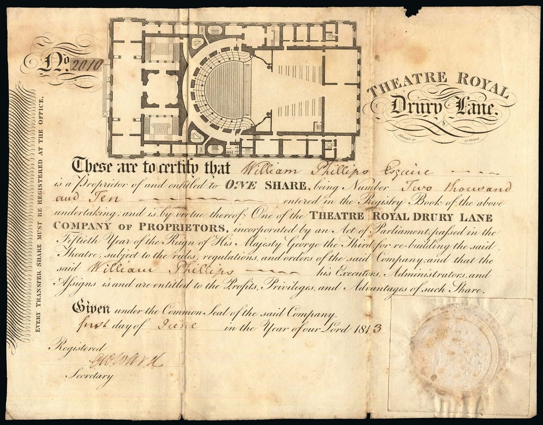 Theatre Royal Drury Lane, one share, 181[3], #2010, lovely plan of the new theatre top centre, black, think paper, paper seal bottom right. The company was formed following the disastrous fire of 1809 that destroyed the previous structure. The new theatre, designed by Benjamin Wyatt opened in 1812. A restoration project announced in 2013 by Andrew Lloyd-Webber's Really Useful Theatres group who then owned the theatre. Some toning, heavy fold, small area of chipping top edge, GF and rare.