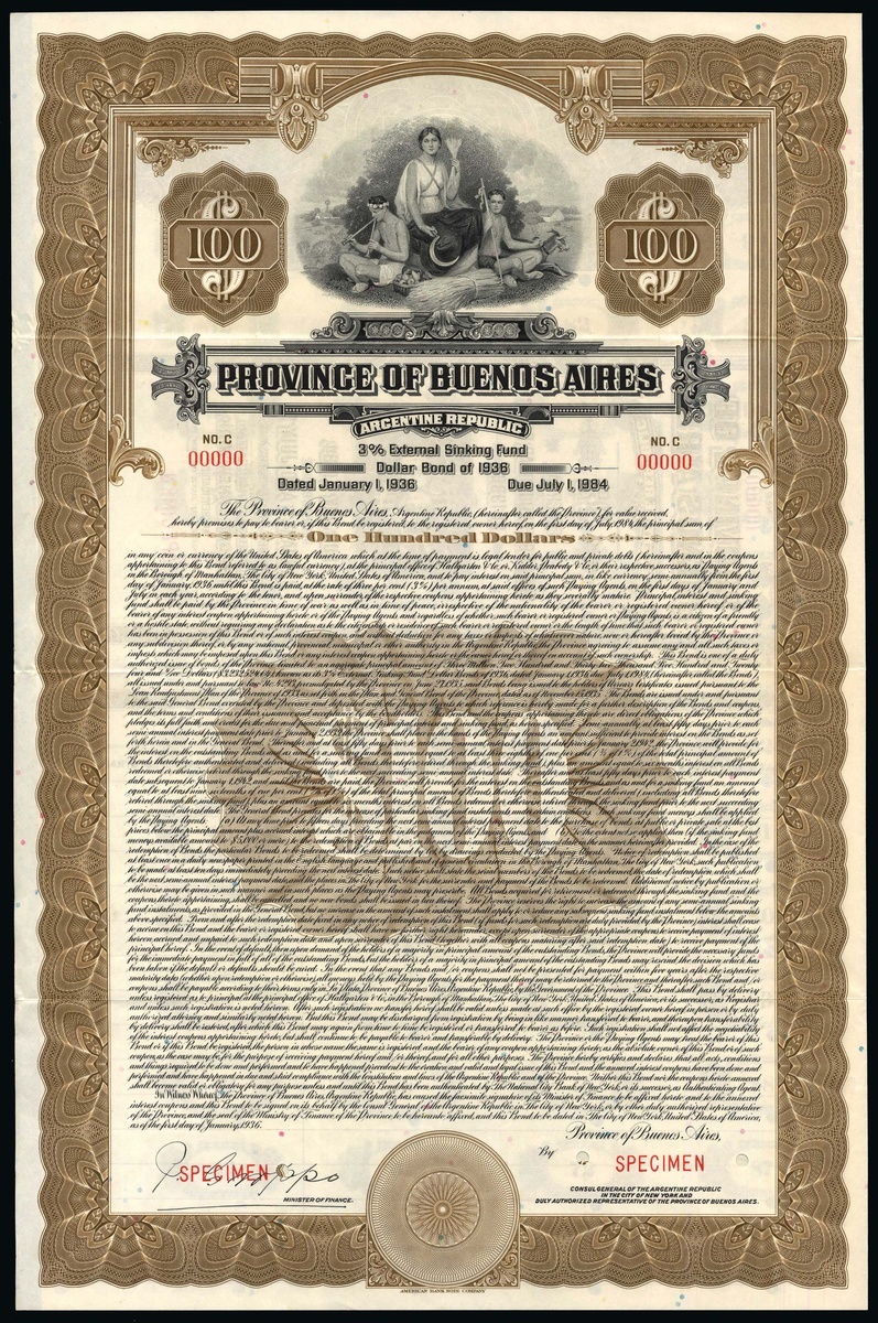 Province of Buenos Aires, 1936, 3% External Sinking Fund Loan, $100 bond, a specimen certificate from the American Bank Note Co. archives, allegorical figures at top, brown and black, numbered 00000 overprinted specimen over signature areas. This loan is only known in specimen form as it has been repaid by the rgentine Government. Less than 5 exist. Trifolded, AEF.