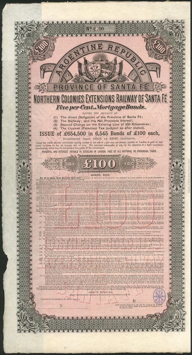 Argentine Republic, Province of Santa Fe, 5% Loan for the Northern Colonies Extensions Railway of Santa Fe, 1885, a specimen £100 bond from the Bradbury, Wilkinson archive, large format, arms at top, black, pink underprint, with coupons. Sllightly uneven left edge but AEF and rare. Only two pieces found in the archive. No issued bonds seen. [R11]