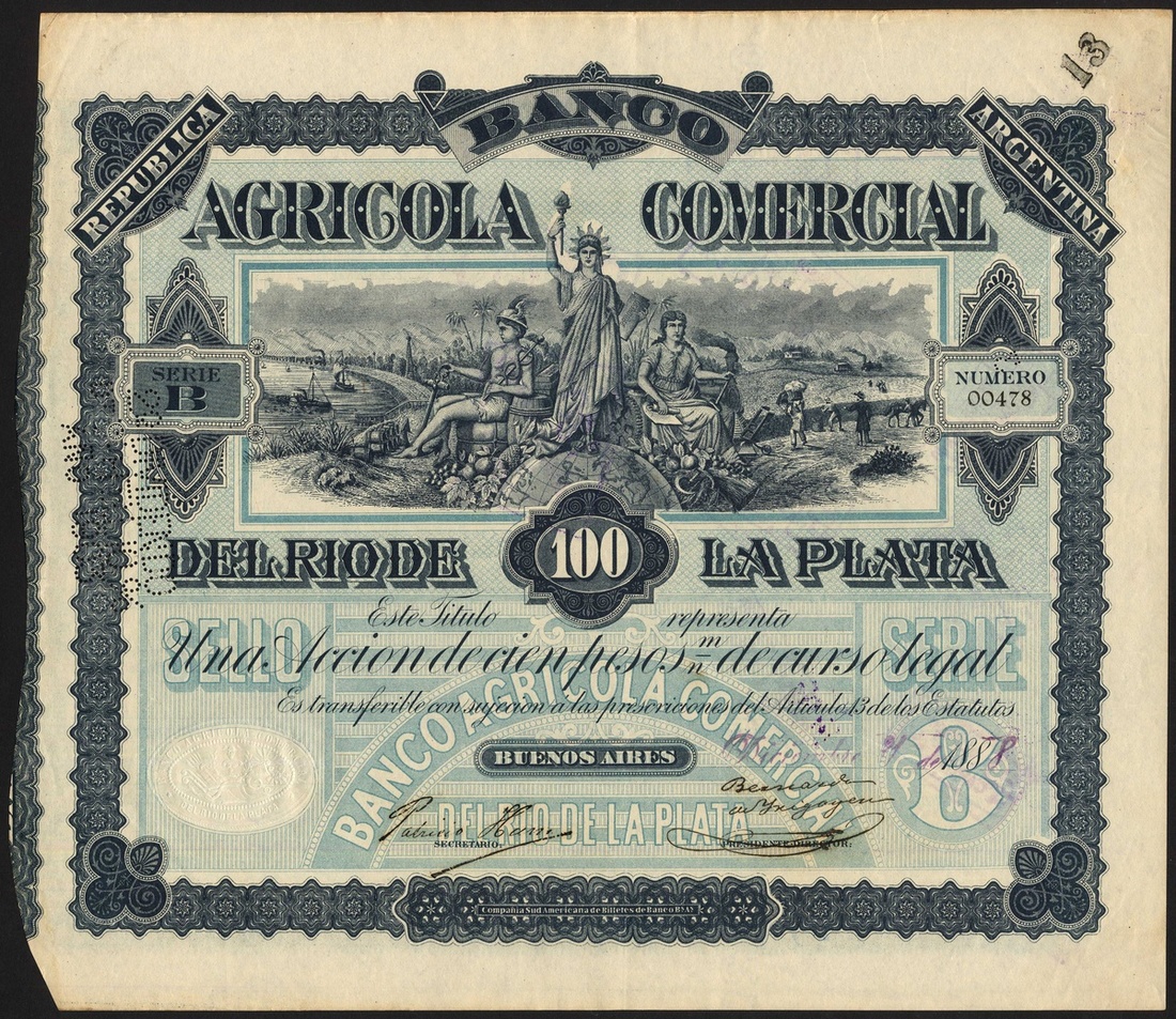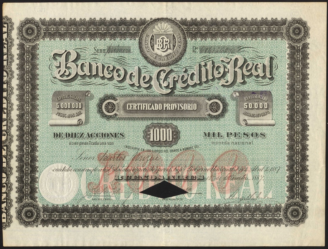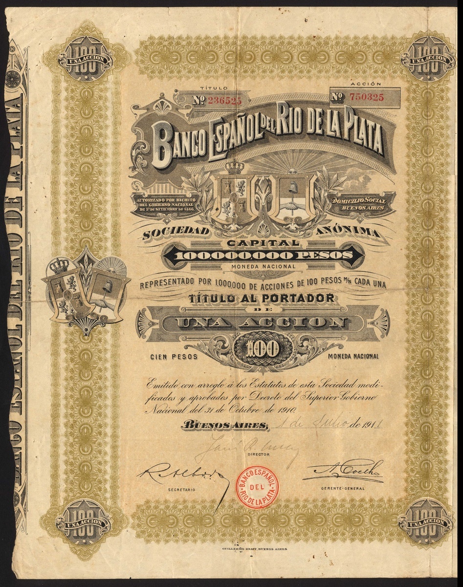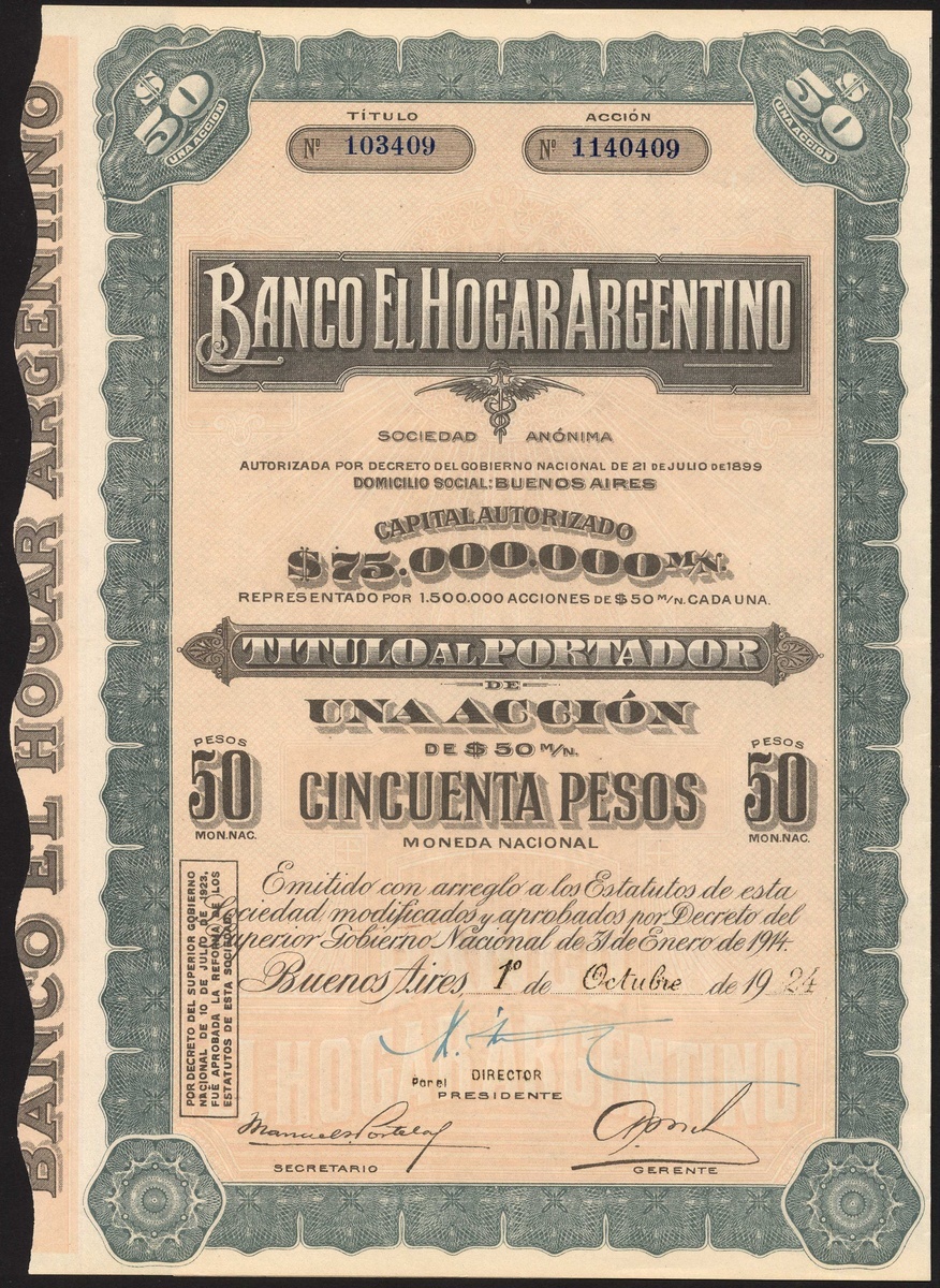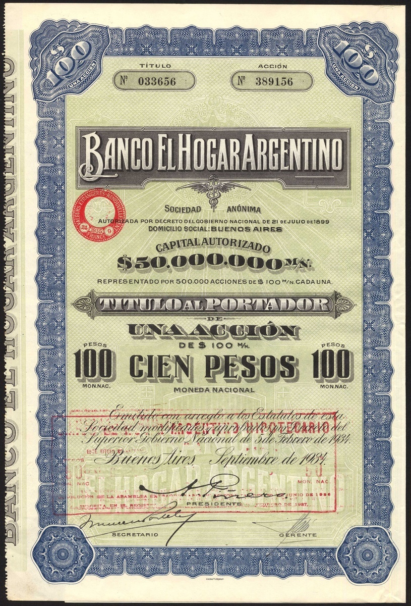 Argentina: A good collection of Banking companies (37), comprising Banco Nacional Inmobiliario, 100 peso share, 1891; Banco Agricola comercial del Rio de la Plata, 5 shares, series A, and one share, series B, both 1888; Banco Constructor de la Plata, 100 peso bond, 1888; Banco de Credito Real, provisional certificates for 1 share, 1888 and 10 shares, 1887; Banco Franco-Argentino de Descuentos, 50 shares, 1909; Banco de Buenos Aires, 1 share, 1911; Banco Espanol del Rio de la Plata, one share, 1911, another different design, 1924; Banco Comercial del Azul, 5 shares, 1920; Banco Frances del Rio de la Plata, third share, 1934; Financiera e Inmobiliaria del Rio de la Plata, third share, 1934; Banco el Hogar Argentino, 50 peso share, 1924 and 100 peso share, 1934, and other certificates (22), dated 1910 to 1983. Many colorful and attractive, especially the early pieces. Mixed condition but most are VF and better, several scarce (37).