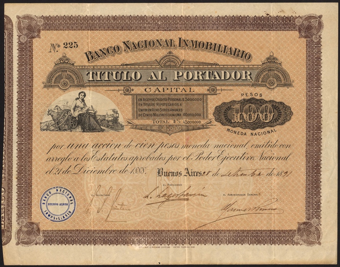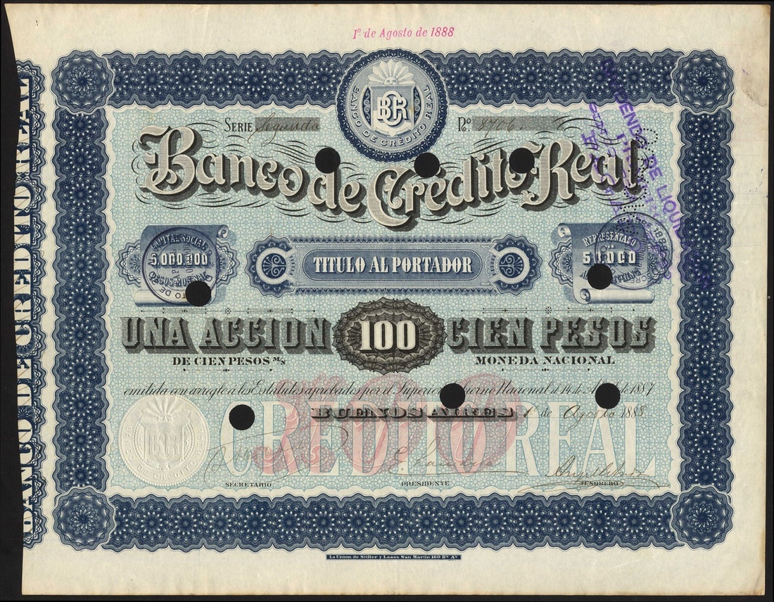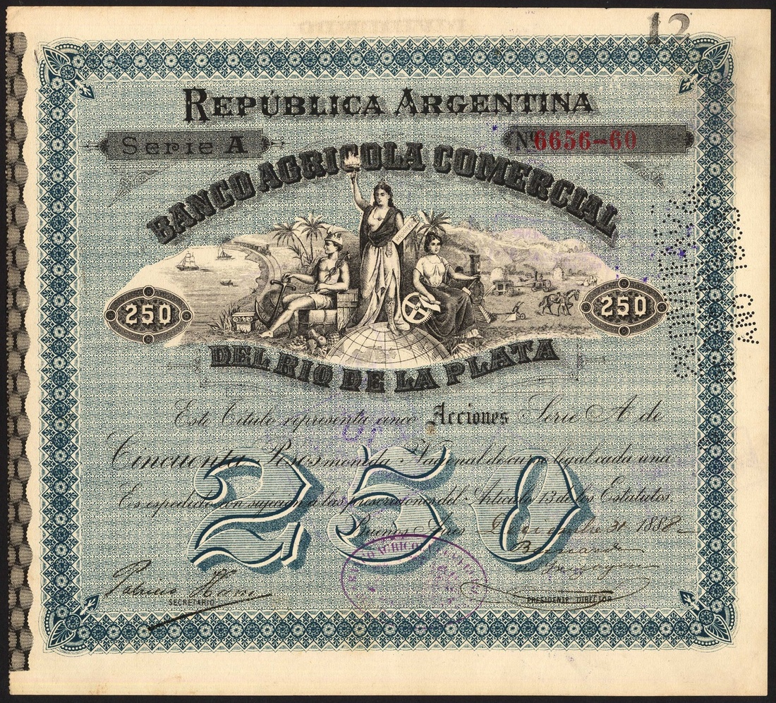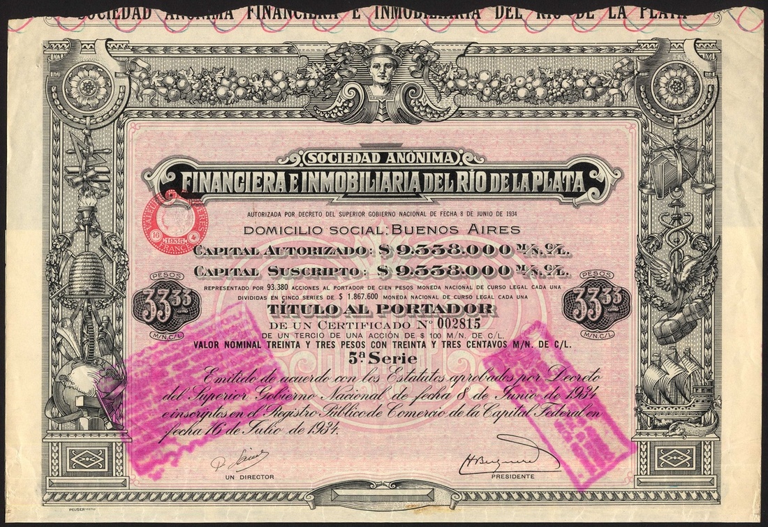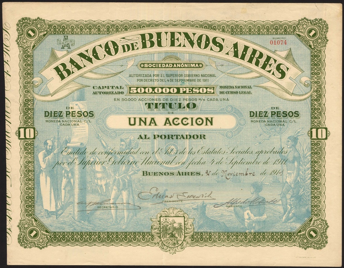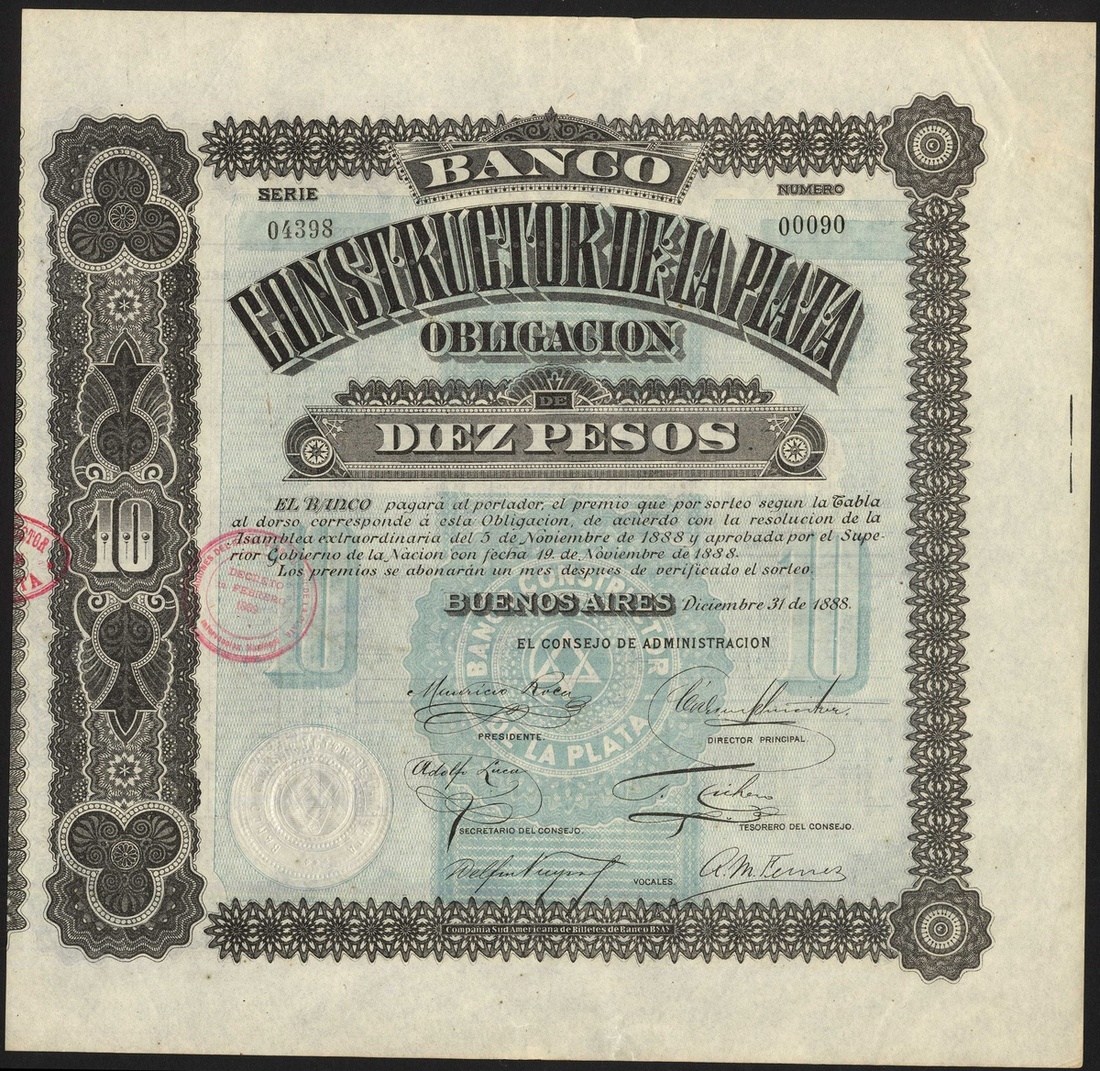 Argentina: A good collection of Banking companies (37), comprising Banco Nacional Inmobiliario, 100 peso share, 1891; Banco Agricola comercial del Rio de la Plata, 5 shares, series A, and one share, series B, both 1888; Banco Constructor de la Plata, 100 peso bond, 1888; Banco de Credito Real, provisional certificates for 1 share, 1888 and 10 shares, 1887; Banco Franco-Argentino de Descuentos, 50 shares, 1909; Banco de Buenos Aires, 1 share, 1911; Banco Espanol del Rio de la Plata, one share, 1911, another different design, 1924; Banco Comercial del Azul, 5 shares, 1920; Banco Frances del Rio de la Plata, third share, 1934; Financiera e Inmobiliaria del Rio de la Plata, third share, 1934; Banco el Hogar Argentino, 50 peso share, 1924 and 100 peso share, 1934, and other certificates (22), dated 1910 to 1983. Many colorful and attractive, especially the early pieces. Mixed condition but most are VF and better, several scarce (37).