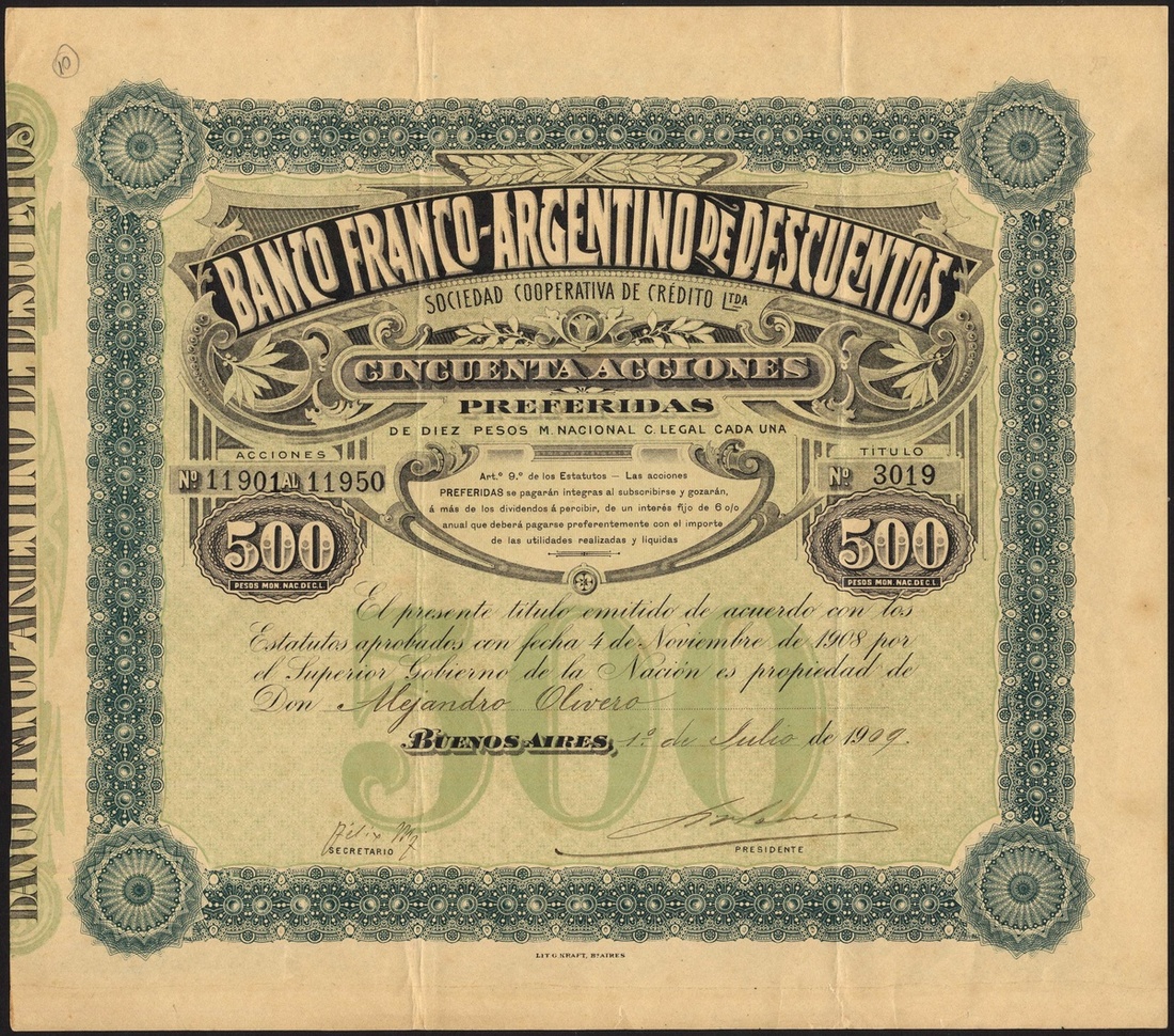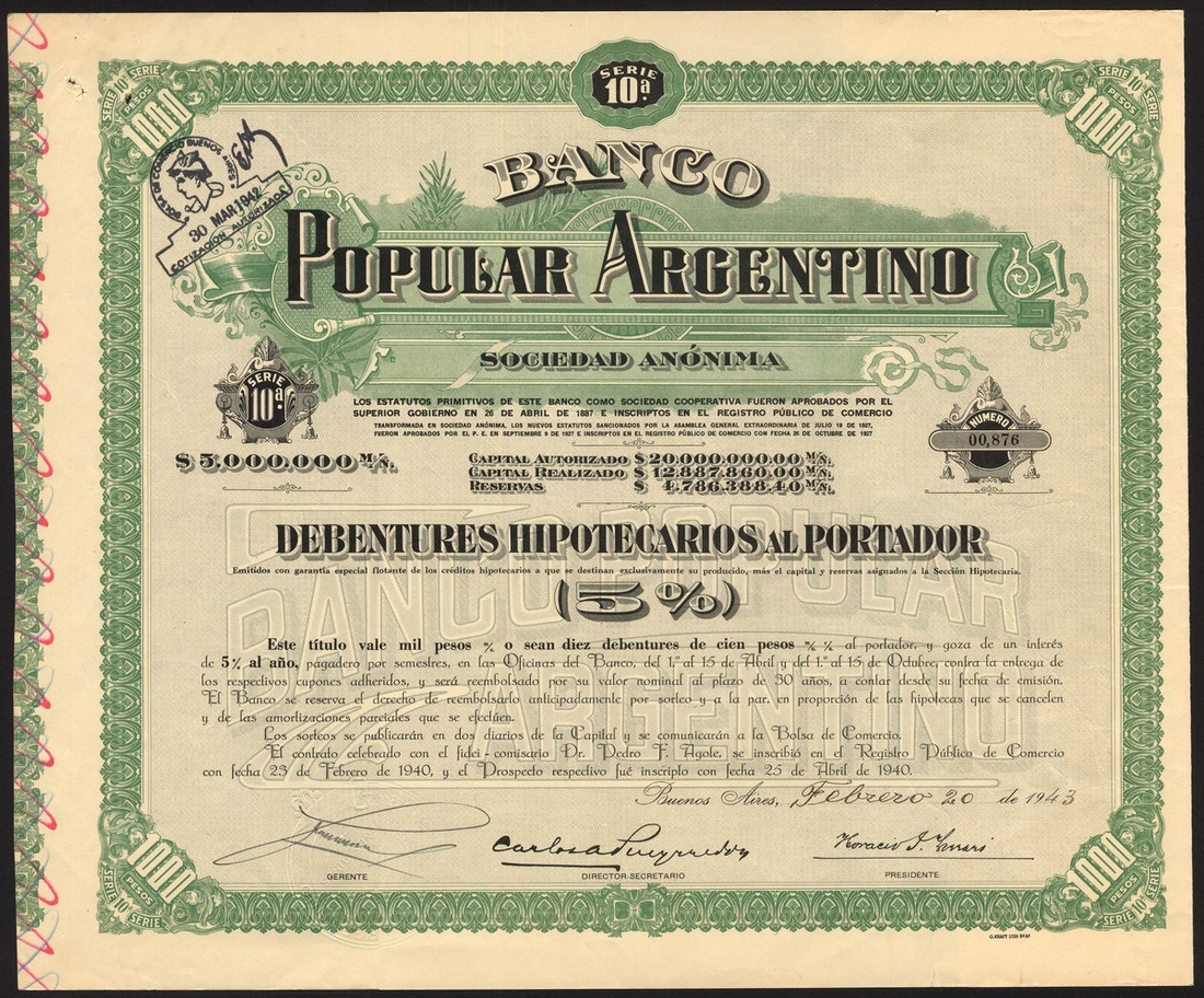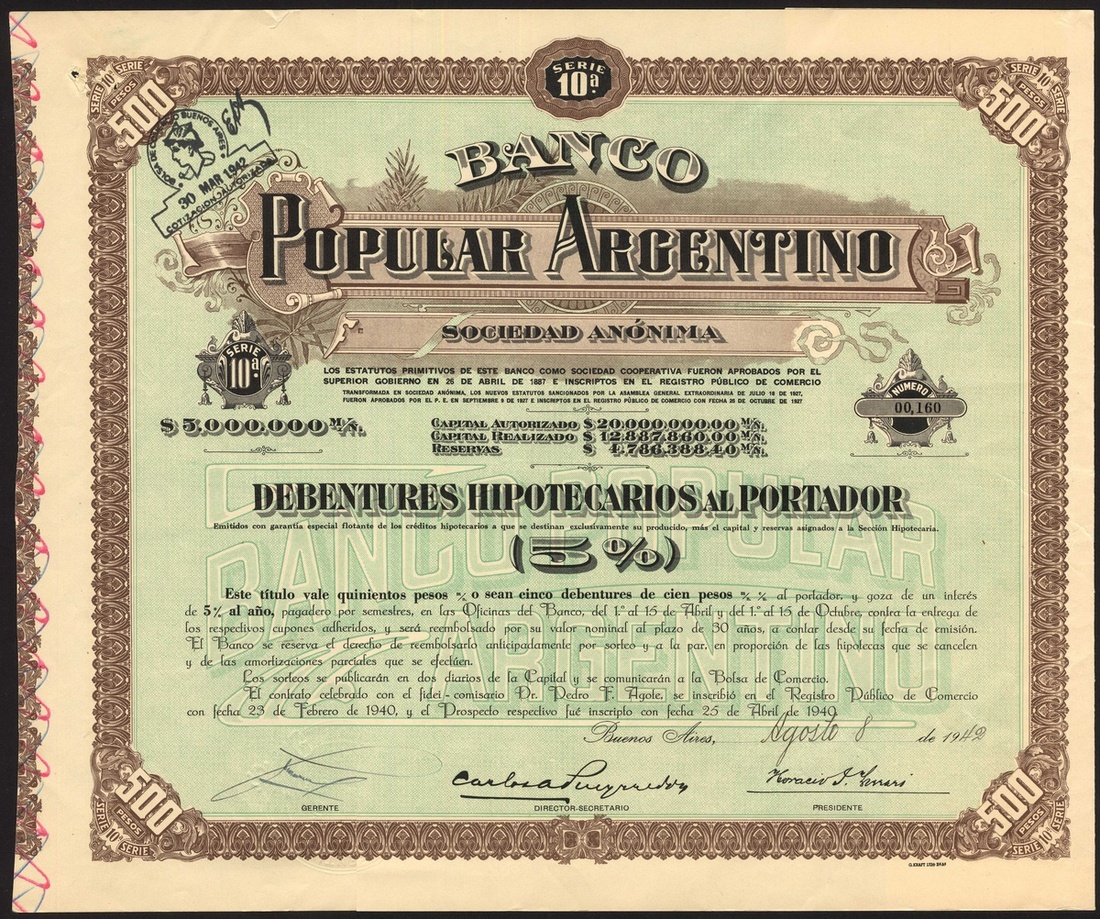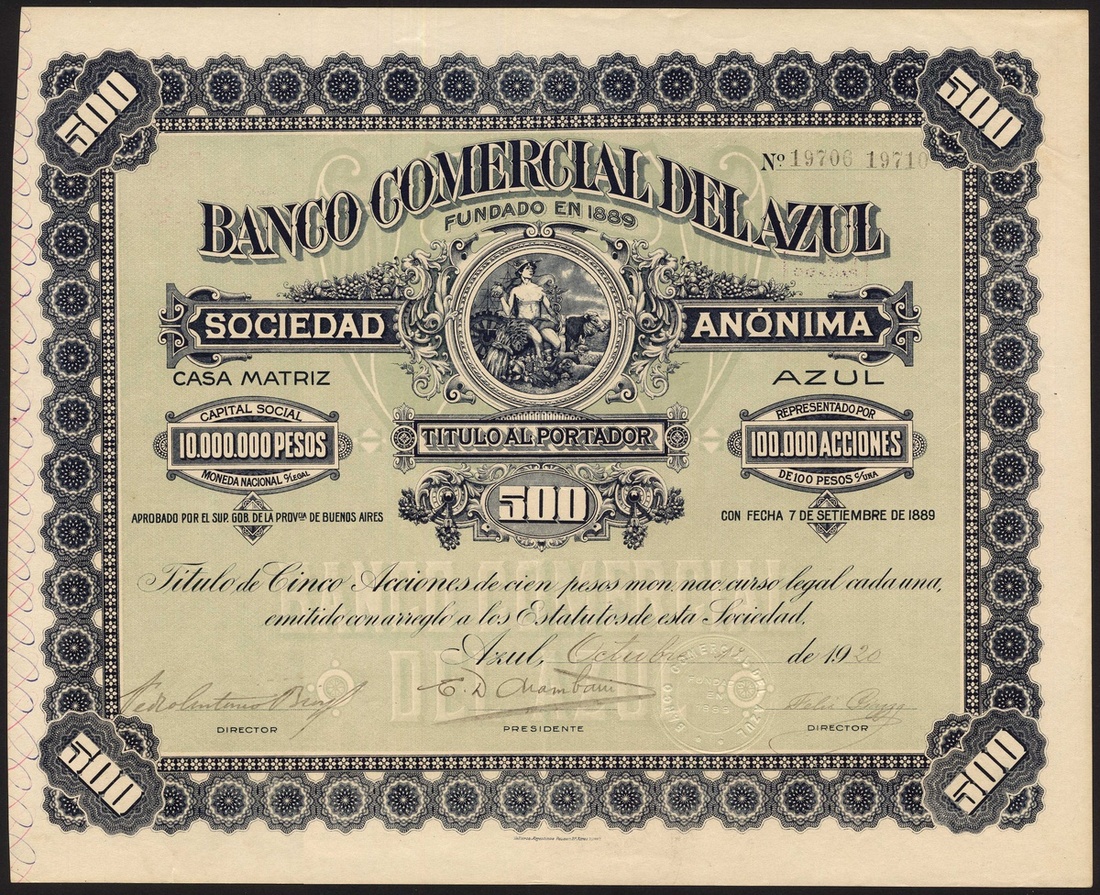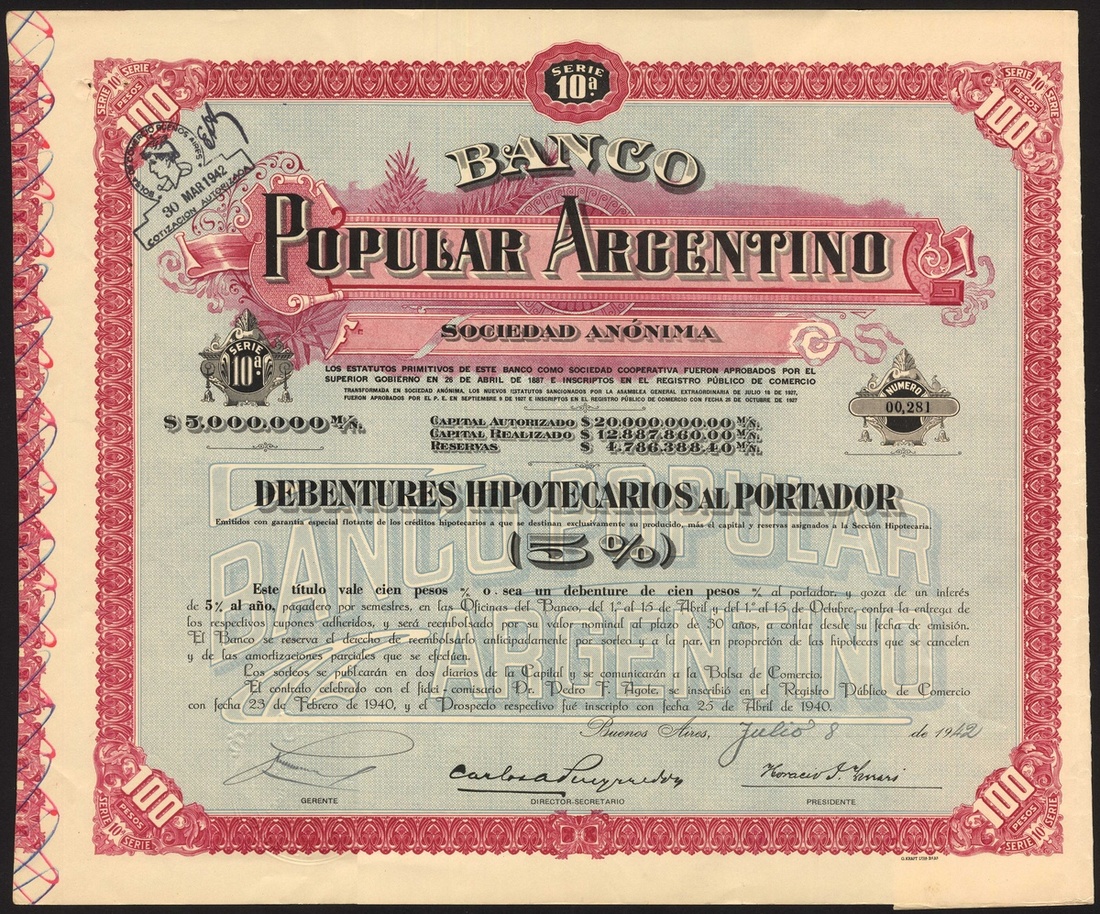 Argentina: A good collection of Banking companies (37), comprising Banco Nacional Inmobiliario, 100 peso share, 1891; Banco Agricola comercial del Rio de la Plata, 5 shares, series A, and one share, series B, both 1888; Banco Constructor de la Plata, 100 peso bond, 1888; Banco de Credito Real, provisional certificates for 1 share, 1888 and 10 shares, 1887; Banco Franco-Argentino de Descuentos, 50 shares, 1909; Banco de Buenos Aires, 1 share, 1911; Banco Espanol del Rio de la Plata, one share, 1911, another different design, 1924; Banco Comercial del Azul, 5 shares, 1920; Banco Frances del Rio de la Plata, third share, 1934; Financiera e Inmobiliaria del Rio de la Plata, third share, 1934; Banco el Hogar Argentino, 50 peso share, 1924 and 100 peso share, 1934, and other certificates (22), dated 1910 to 1983. Many colorful and attractive, especially the early pieces. Mixed condition but most are VF and better, several scarce (37).