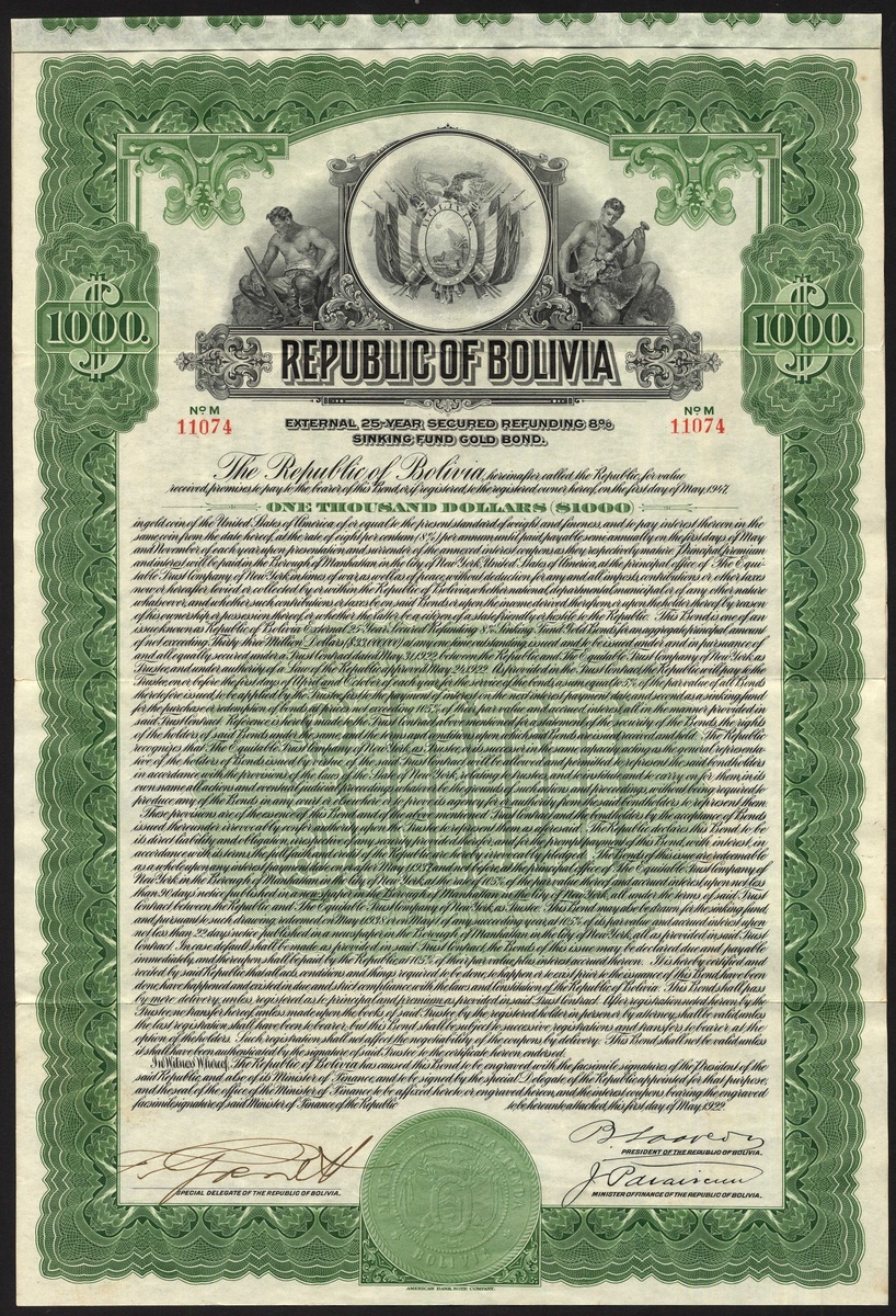 (x) Republic of Bolivia, External 25yr Secured Refunding 8% Sinking Fund Gold Loan 1922, bond for $1000, #11074, Bolivian coat of arms top centre with allegorical figures each side, ornate border, black and green, with coupons, NOT cancelled. EF.