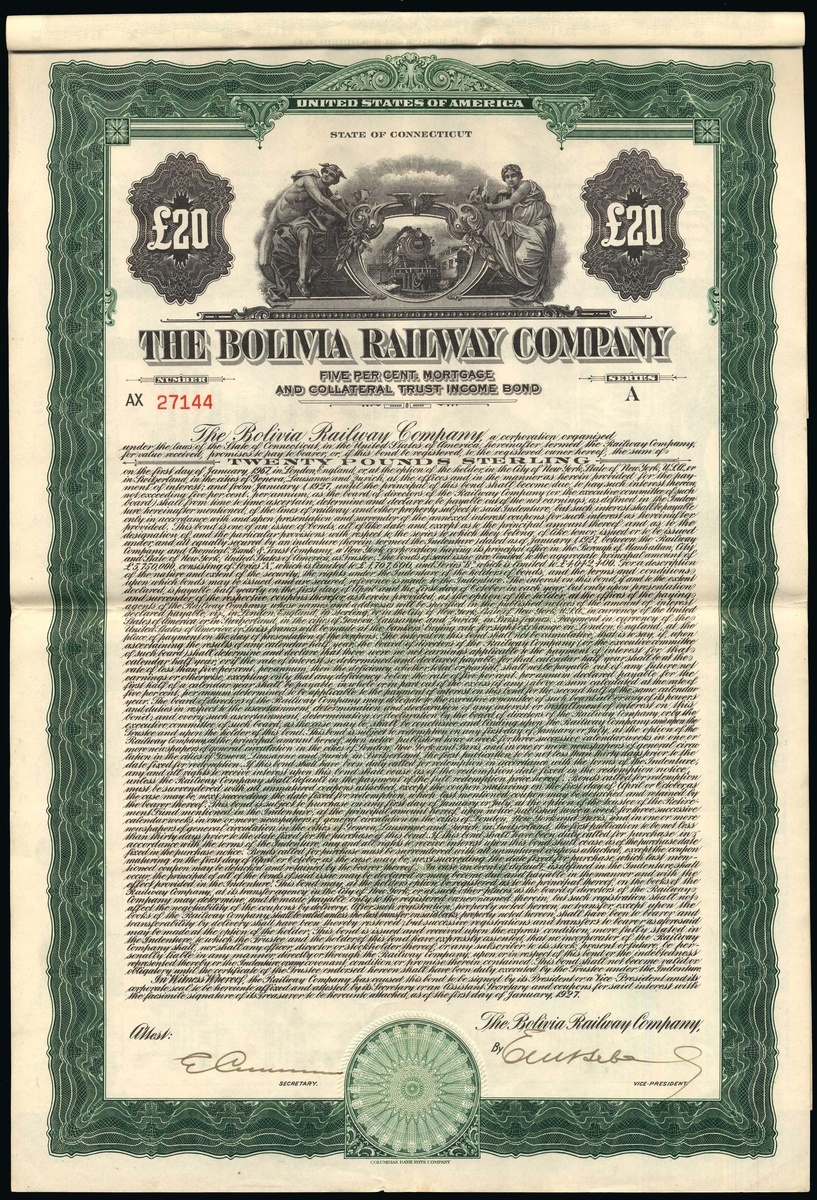 Bolivia Railway Company, 5% Mortgage and Collateral Trust Income Bond, £20, 1927, #27144, steam train flanked by allegorical figures, green, American style certificate printed by Columbian bank Note Co., with coupons. GVF and scarce.