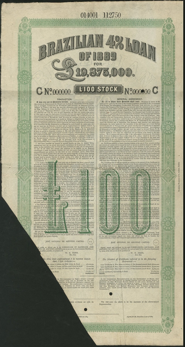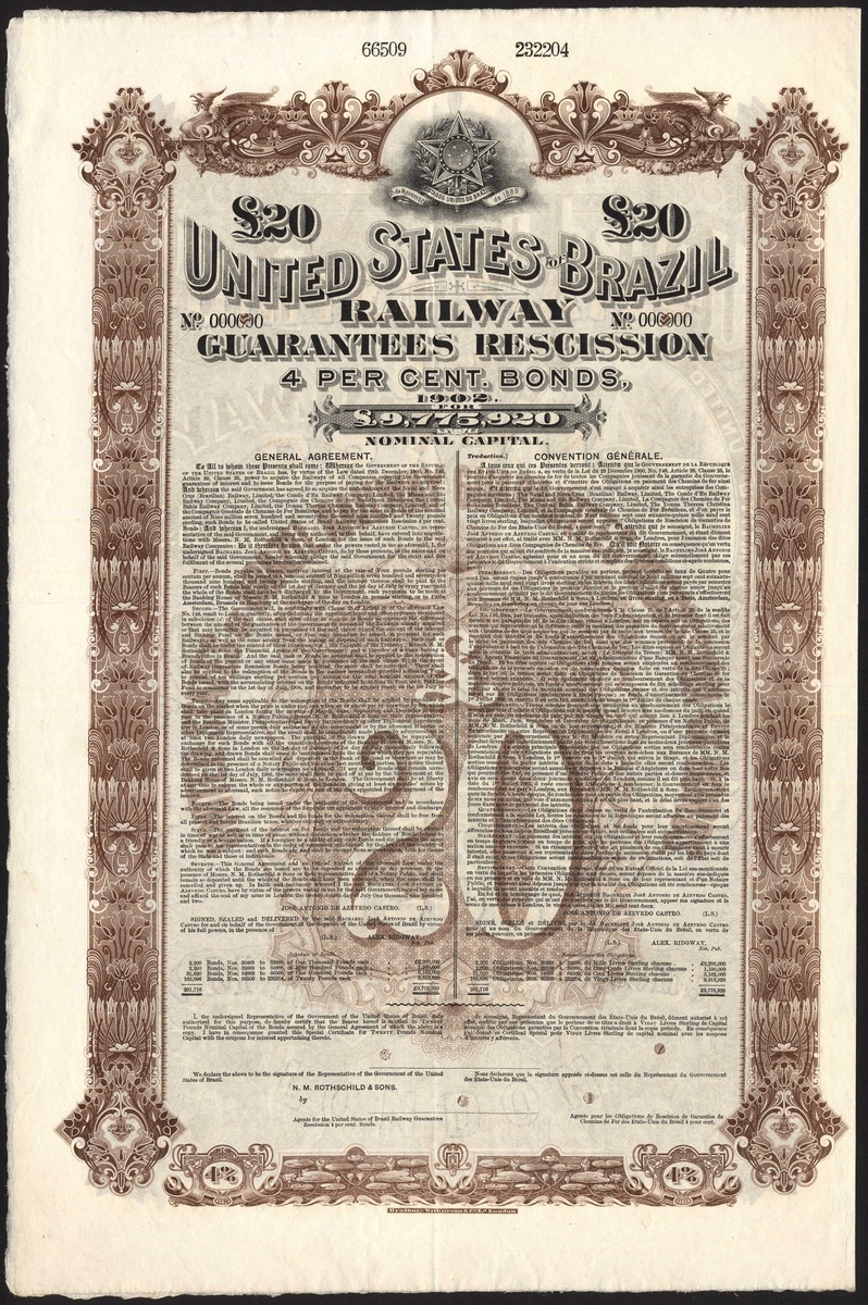 United States of Brazil, Railway Guarantees Rescission 4% Loan, 1902, a specimen £20 bond from the Bradbury, Wilkinson & Co. archive, large format piece with ornate borders, Brazilian arms at top, brown and black, with coupons. AEF; Together with Brazilian 4% Loan of 1889, a specimen £100 bond also from the Bradbury, Wilkinson archive, ornate border, green. Large piece cut away from bottom left, nevertheless a very rare piece of which no issued examples have been seen (2)