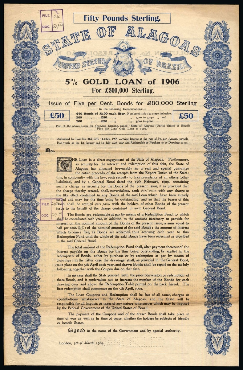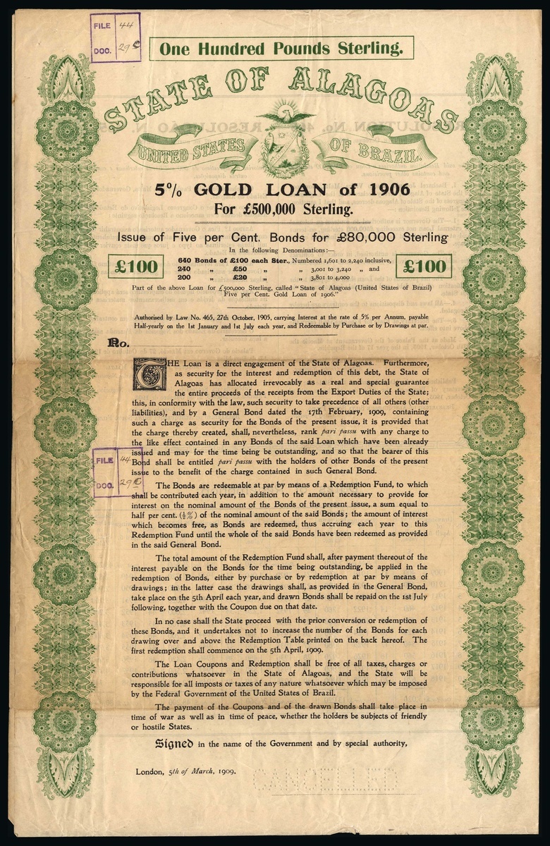 State of Alagoas, 5% Gold Loan, 1906, pair of specimen bonds for £50 (one of only 240 issued) and £100 (640 issued), part of £500,000 loan, dated London 1909, ornate scrollwork at sides, coat of arms at top, blue and green respectively, perforated CANCELLED and stamped with file location on face, with all coupons, together with coloured map of the state. The £100 bond has been seen issued, we have never seen an issued example of the £50 piece. Light toning, very fine and rare (2+map).