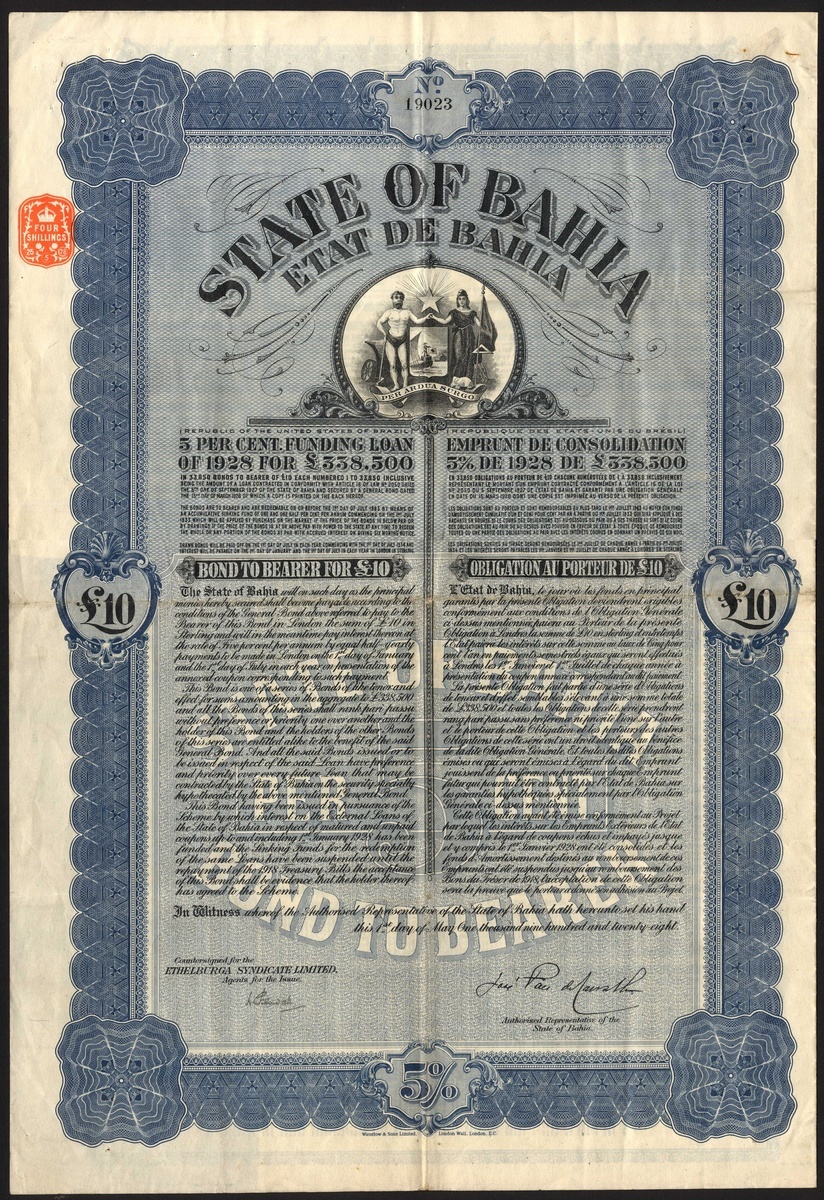 Brazil: State of Bahia, 5% Funding Loan 1928, bond for £10, #19023, large format piece with arms at top, blue and black, printed by Waterlow & Sons, with original coupons from 1932 onwards, unassented. GVF and NOT cancelled, rare thus.