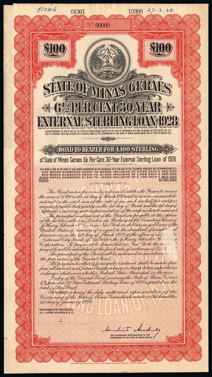 State of Minas Geraes, 6½% 30yr External Sterling Loan of 1928, a set of specimen bonds for £100, £500 and £1000 from the Bradbury, Wilkinson & Co. archive, large format pieces with State coat of arms at top, red, green and blue respectively, with coupons, small hole cancels in signature area. GVF-EF (3) [all R11].