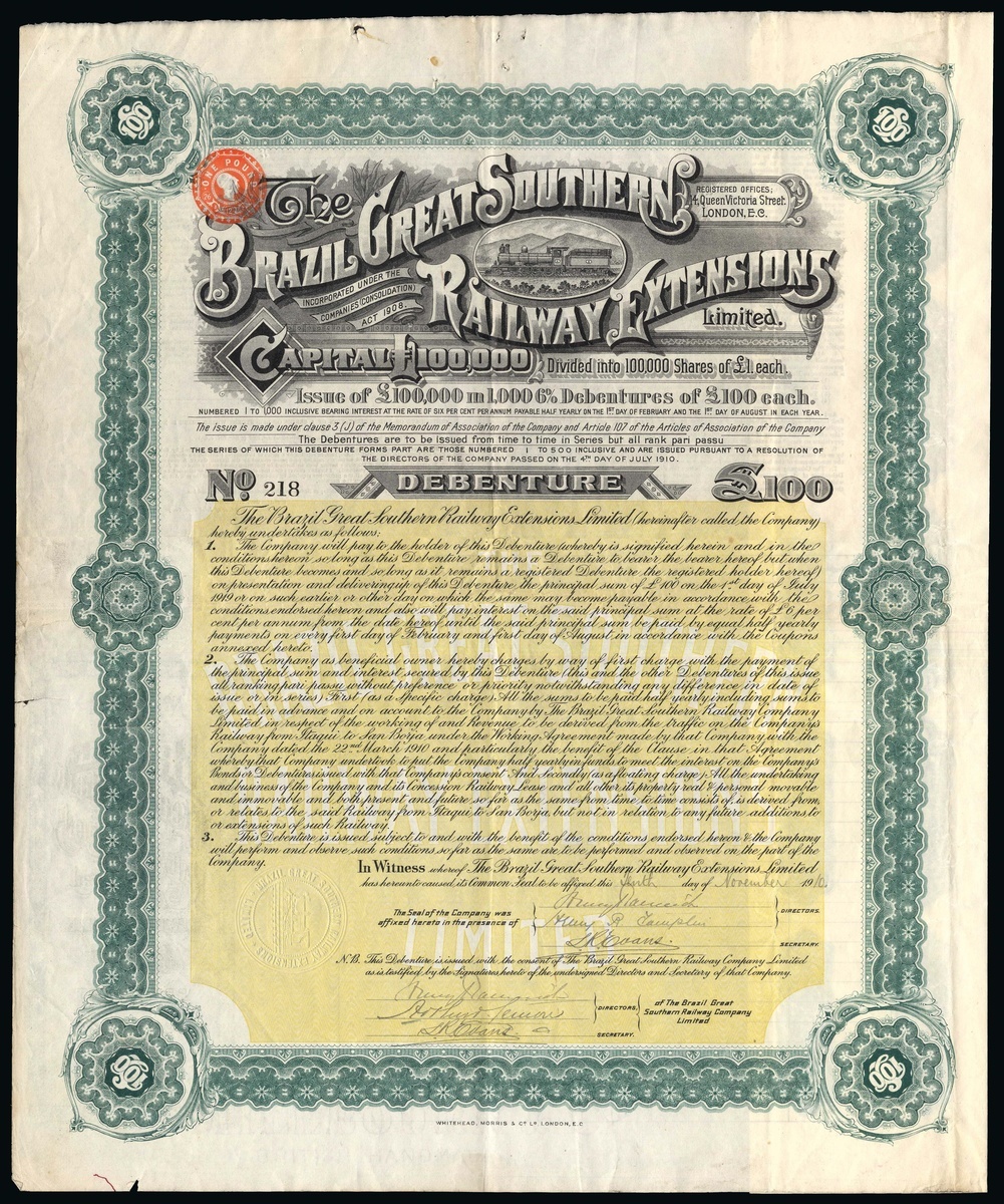 Brazil Great Southern Railway Extensions Ltd., 6% Debenture for £100, 19[10], #218, large format piece, steam engine in title, ornate border, green and black, orange underprint, with coupons. Filing holes at top, small tear to left side, otherwise F-VF.