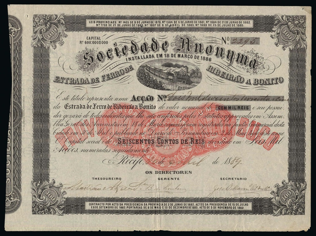 Brazil: Estrada de Ferro de Ribeirao a Bonito, 100 milreis share, Recife 18[89], #2295, steam train at top, ornate border, black, red underprint. Inaugurated to build line connecting the 2 towns in Pernambuco in 1887. Leased to the Great Western Railway in 1905. Pinholes, VF and rare.
