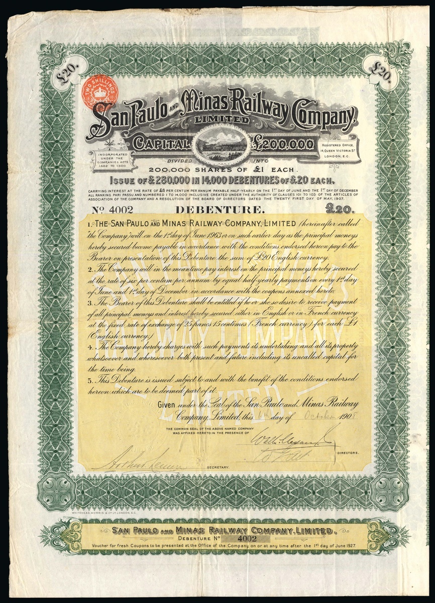 San Paulo and Minas Railway Co. Ltd., 6% Debenture for £20, 190[8], #4002, very large format piece with ornate border, steam train under title, black and green with pale orange underprint, with coupons. Founded to facilitate the purchase of the existing San Simao Railway (Bento Quirino, on the Mogyana Railway to Serra Azul, Sao Paulo). The company extended the line over 70 miles to reach Minas Geraes. Pin holes top left, otherwise VF.