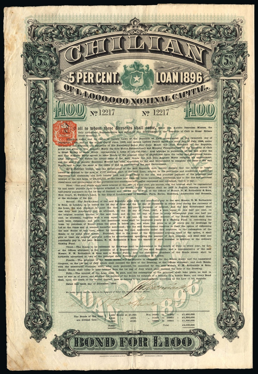 Chilian 5% Loan, 1896, bond for £100, #12217, large format piece with ornate border, Chilian arms at top, green and black, printed by Bradbury, Wilkinson & Co., with coupons from 1932. The loan went into default but was reorganised and was finally called for redemption in recent years. This unassented, missing the loan reorganisation. F-VF and rare.