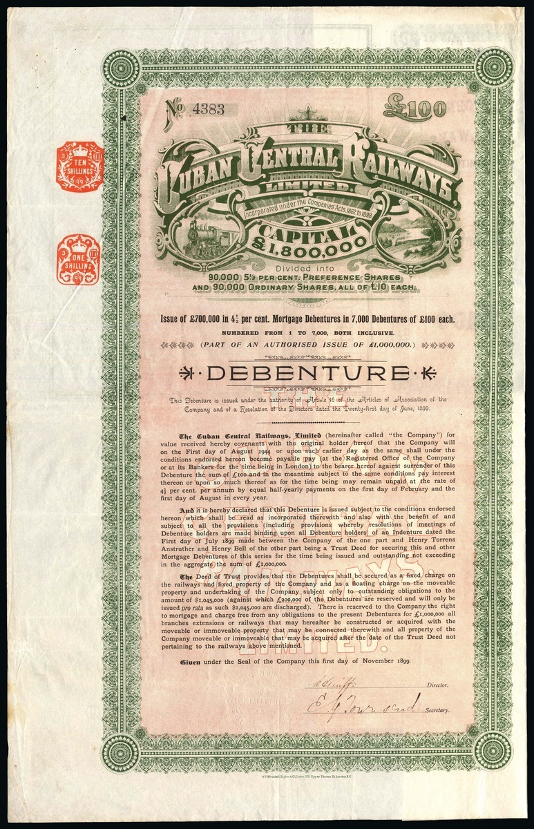 Cuban Central Railways Ltd., 4½% mortgage debenture for £100, 1899, #4383, very large format, steam train at top, green, pink underprint, with coupons, VF and rare [R10}