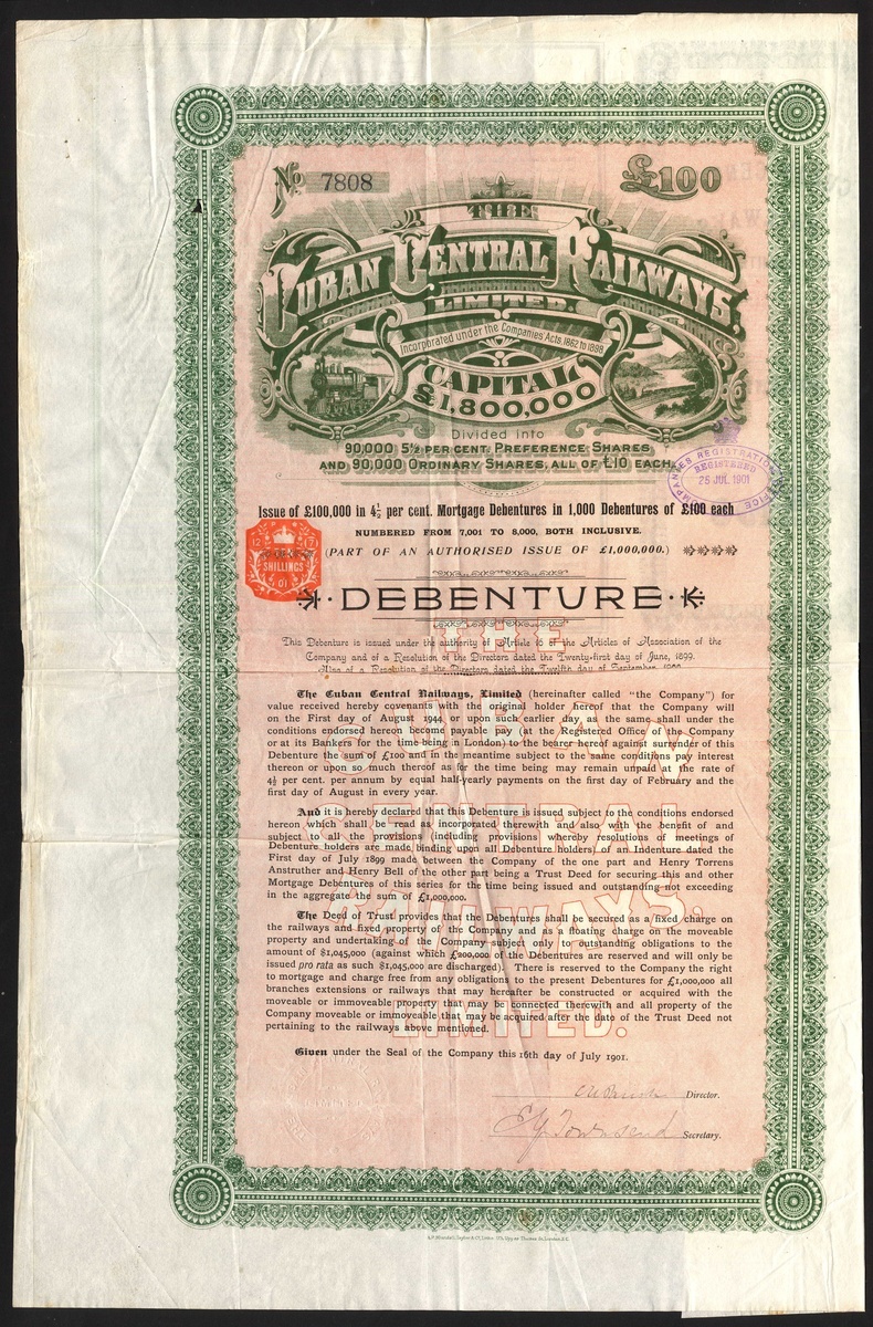 Cuban Central Railways Ltd., 4½% mortgage debenture for £100, 2nd issue, 1901, #7808, very large format, steam train at top, green, pink underprint, with coupons, Spike hole at top, AVF and rare [R11}