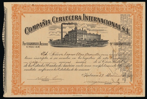 Compañia Cervecera Internacional S.A., three certificates comprising 100 peso shares, Havana 19[35], vignette of brewery at top, ornate border, orange and black; 'Series First Bond for $500, 1915, allegorical figures beside title, orange and black, and bond for $100, series C, 1928, brewery at top, blue and black. Some foxing on all, the third with rough edges, about VF and F respectively (3).