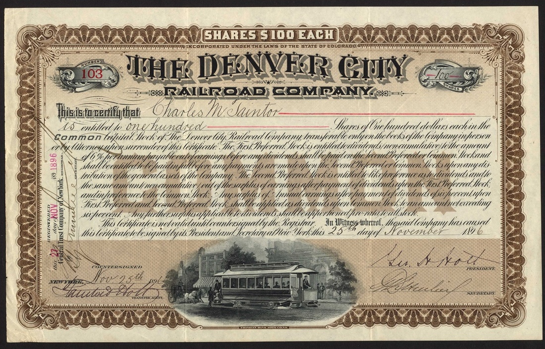 Denver City Railroad Co. (CO), $100 common shares, 189[6], #103, streetcar in city at bottom, ornate border, brown and black. Pin holes bottom left, VF.