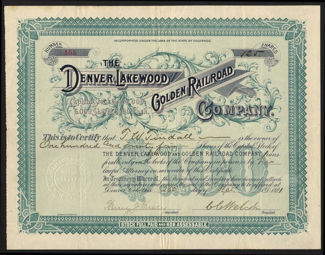 Denver, Lakewood and Golden Railroad Co. (CO), $100 shares, 189[1], #155, decorative title with scrollwork, green and black with green underprint, embossed seal. VF.