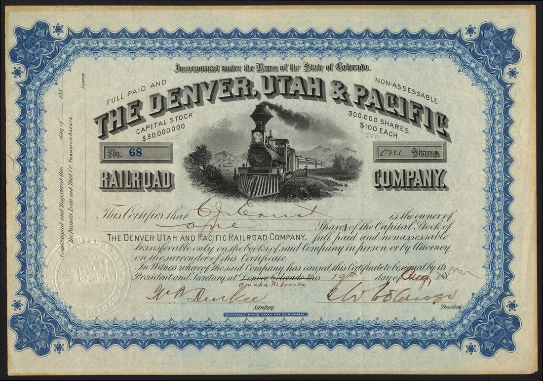 Denver, Utah & Pacific Railroad Co. (CO), $100 shares, 188[1905], #68, steam train in countryside in centre, ornate border, blue and black, embossed seal bottom left. Slight discolouration to extreme edge, otherwise GVF.