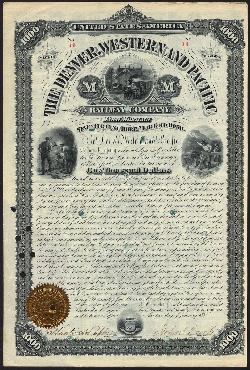 Denver, Western and Pacific Railway Co. (CO), first mortgage 7% 30yr Gold Bond for $1000, 1881, #76, train passing building at top, mining scene and man waving flag at sides, ornate border, black, gold paper seal, with coupons, hole cancelled. Nicks to top edge, AVF.