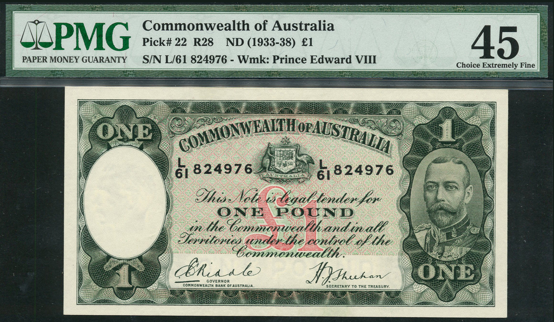 (x) Commonwealth of Australia, £1, ND (1933-38), serial number L/61 824976, dark green on green and red underprint, George V at right, arms at top centre, value at centre and corners, reverse green, shepherds and sheep at centre