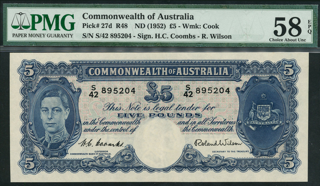 (x) Commonwealth of Australia, £5, ND (1952), serial number S/42 895204, blue on red and green underprint, George VI at left, arms at right, value at centre and corners, reverse blue, dock workers at left