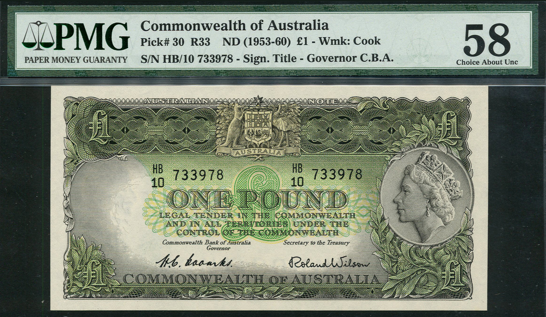 (x) Commonwealth of Australia, 10 shillings and £1, ND (1954-60), prefixes AE/39 and HB/10, first brown and orange, M. Flinders at right, second black and green, Elizabeth II at right, also a commemorative polymer $10, 1988, in presentation wallet