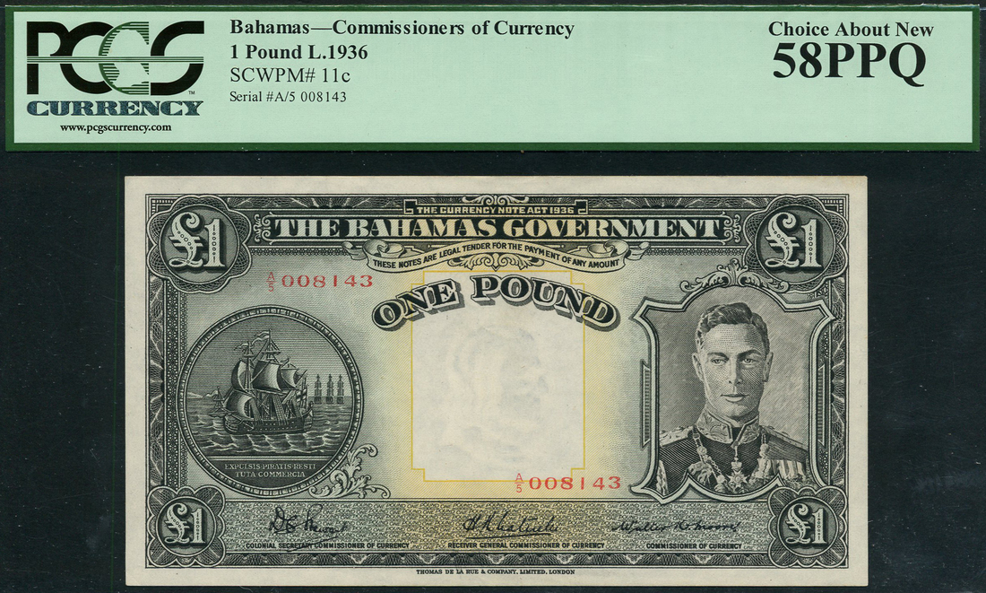 (x) Bahamas Government, £1, ND (1936), serial number A/5 008143, black on yellow and blue underprint, George VI at right, sailing ship seal at left, value at corners, reverse brown and multicoloured, arms at left, value at right
