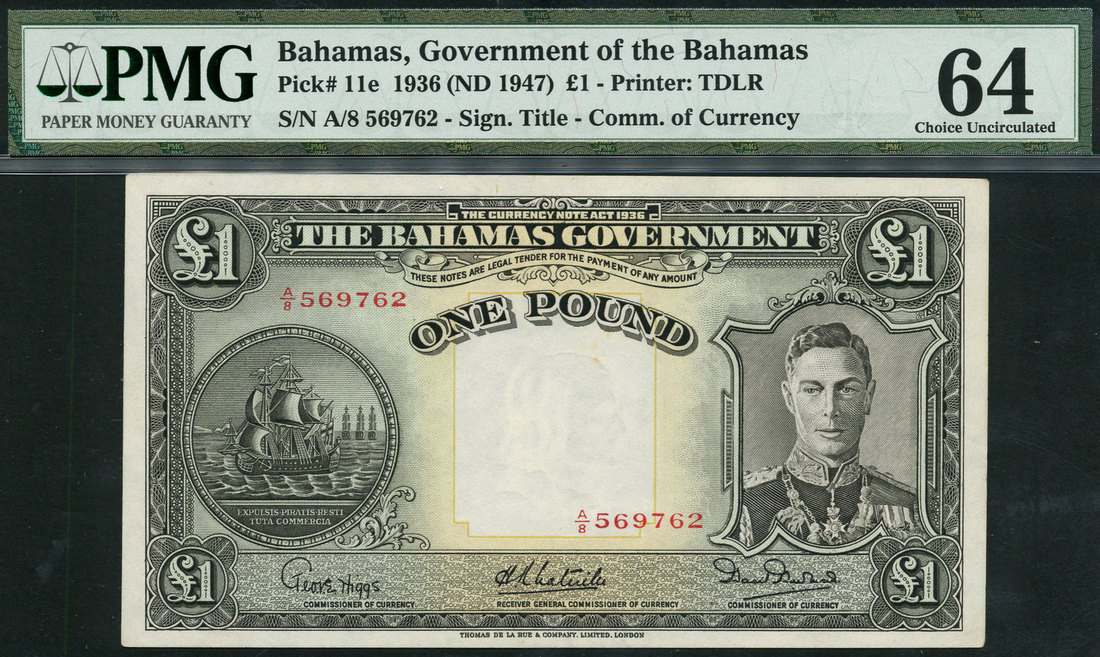 (x) Bahamas Government, £1, ND (1947), serial number A/8 569762, black on yellow and blue underprint, George VI at right, sailing ship seal at left, value at corners, reverse brown and multicoloured, arms at left, value at right