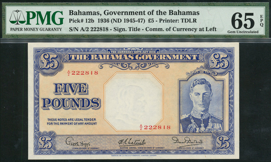 (x) Bahamas Government, £5, ND (1945-46), serial number A/2 222818, blue on tan/orange underprint, George VI at right, sailing ship seal at left, value at corners, reverse blue and multicoloured, arms at left, value at right