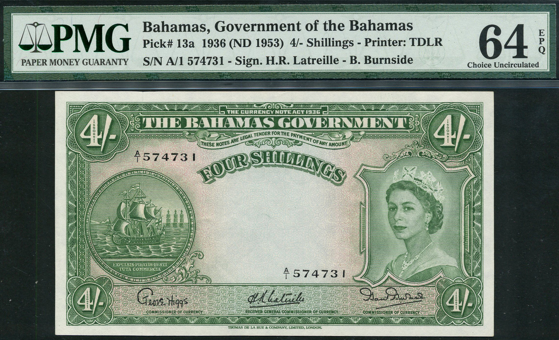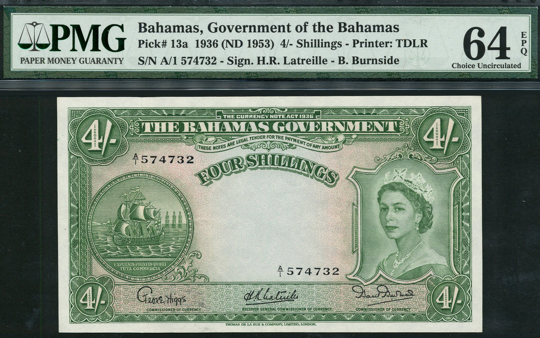 (x) Bahamas Government, 4 shillings (2), ND (1953), consecutive serial numbers A/1 574731-32, green on blue and red underprint, Elizabeth II at right, sailing ship seal at left, value at corners, reverse green, arms at left, value at right, Latreille and Burnside signatures