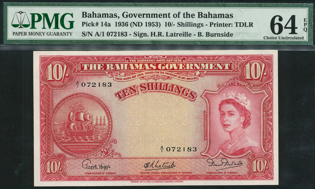 (x) Bahamas Government, 10 shillings, ND (1953), serial number A/1 072183, red on yellow and blue underprint, Elizabeth II at right, sailing ship seal at left, value at corners, reverse red, arms at left, value at right, Latreille and Burnside signatures