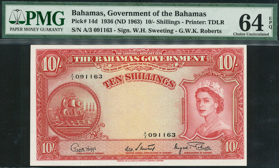 (x) Bahamas Government, 10 shillings, ND (1963), serial number A/3 091163, red on yellow and blue underprint, Elizabeth II at right, sailing ship seal at left, value at corners, reverse red, arms at left, value at right, Sweeting and Roberts signatures