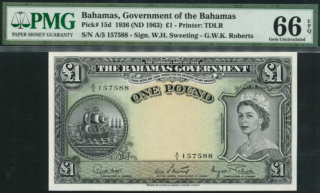 (x) Bahamas Government, £1, ND (1963), serial number A/5 157588, black on yellow and blue underprint, Elizabeth II at right, sailing ship seal at left, value at corners, reverse black, arms at left, value at right, Sweeting and Roberts signatures