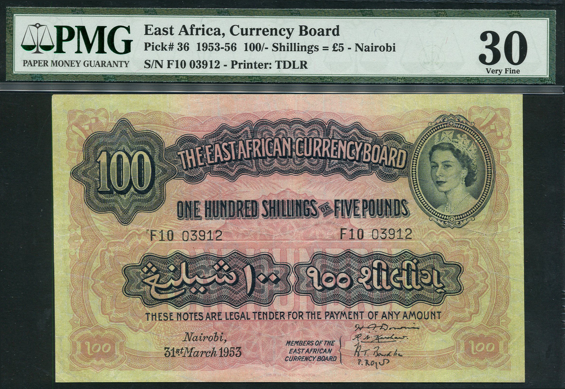 (x) East African Currency Board, 100 shillings or £5, 31 March 1953, serial number F10 03912, dark blue on pink and multicolour underprint, Elizabeth II at top right, value at centre, top left and each corner, reverse pink lion at centre