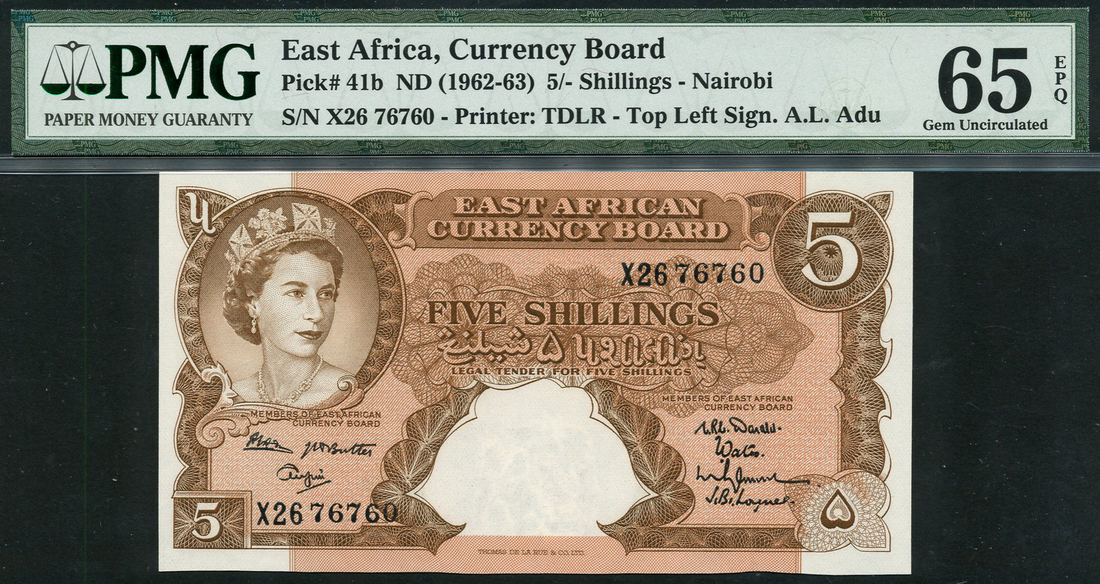 (x) East African Currency Board, 5 shillings, ND (1962), serial number X26 76760, brown, Elizabeth II at top left, value at centre and each corner, reverse brown