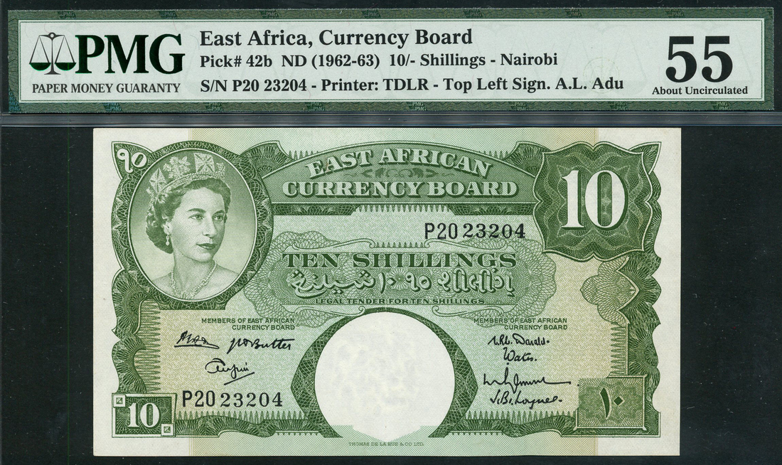 (x) East African Currency Board, 10 shillings, ND (1962), serial number P20 23204, green on multicolour underprint, Elizabeth II at top left, value at centre and each corner, reverse green