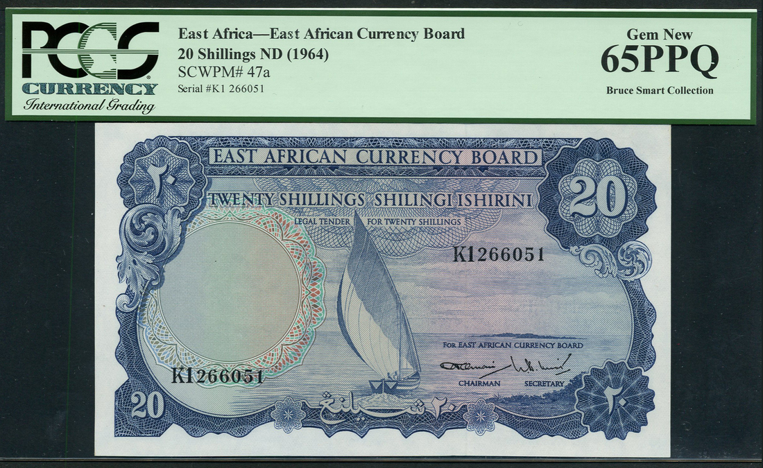 (x) East African Currency Board, 20 shillings, ND (1964), serial number K1 266051, blue on multicolour underprint, sailing boat on Lake Victoria at centre, value at corners, reverse blue, native plants