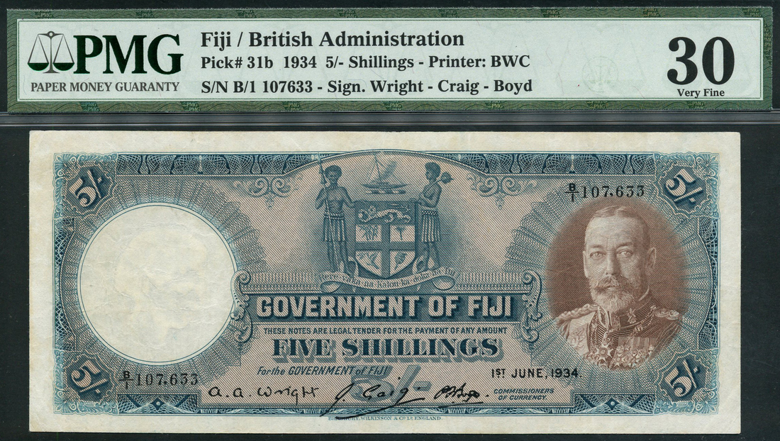 (x) Government of Fiji, 5 shillings, 1 June 1934, serial number B/1 107633, brown and teal, George V at right, arms at top centre, value at low centre and corners, reverse multicolour