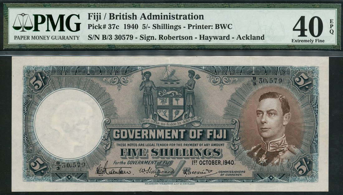 (x) Government of Fiji, 5 shillings, 1 October 1940, serial number B/3 30579, brown and teal, George VI at right, arms at top centre, value at low centre and corners, reverse multicolour