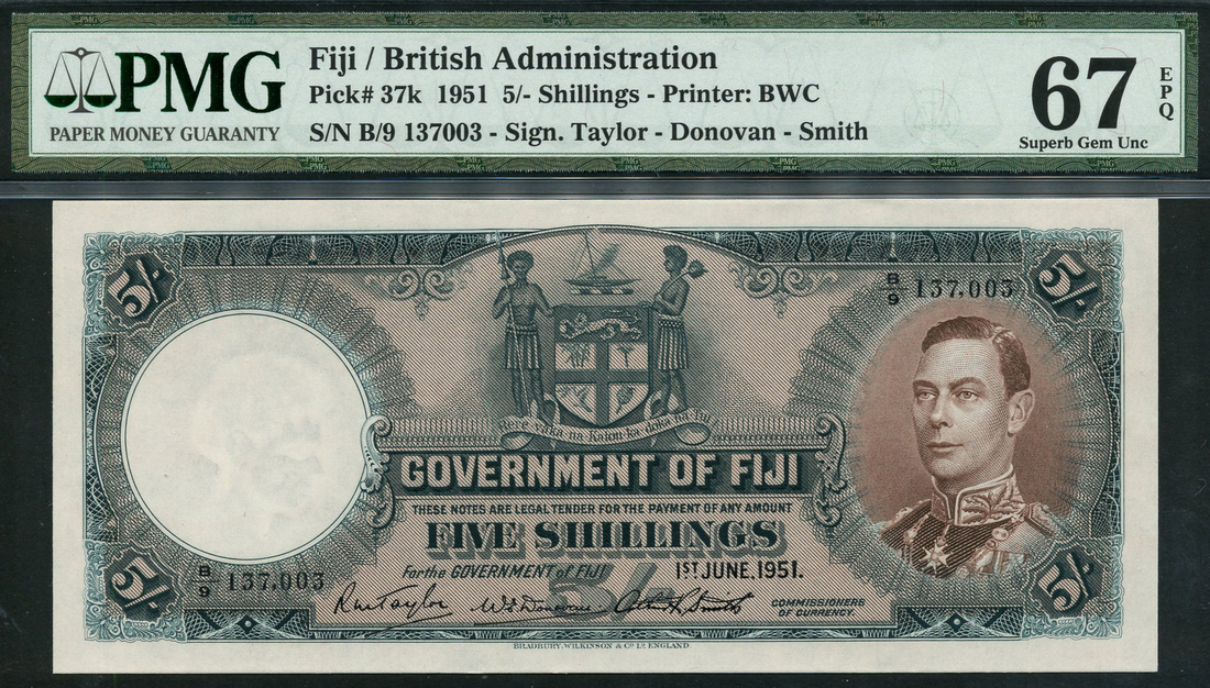 (x) Government of Fiji, 5 shillings, 1 June 1951, serial number B/9 137003, brown and teal, George VI at right, arms at top centre, value at low centre and corners, reverse multicolour