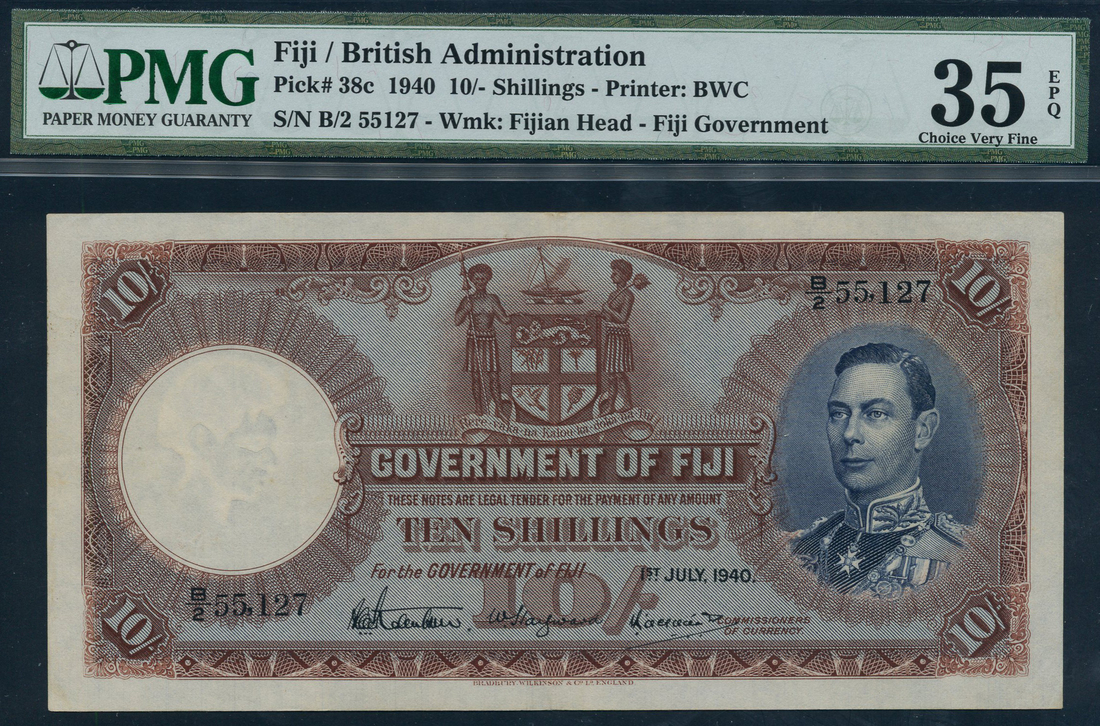 (x) Government of Fiji, 10 shillings, 1 July 1940, serial number B/2 55127, red-brown and blue, George VI at right, arms at top centre, value at low centre and corners, reverse multicolour