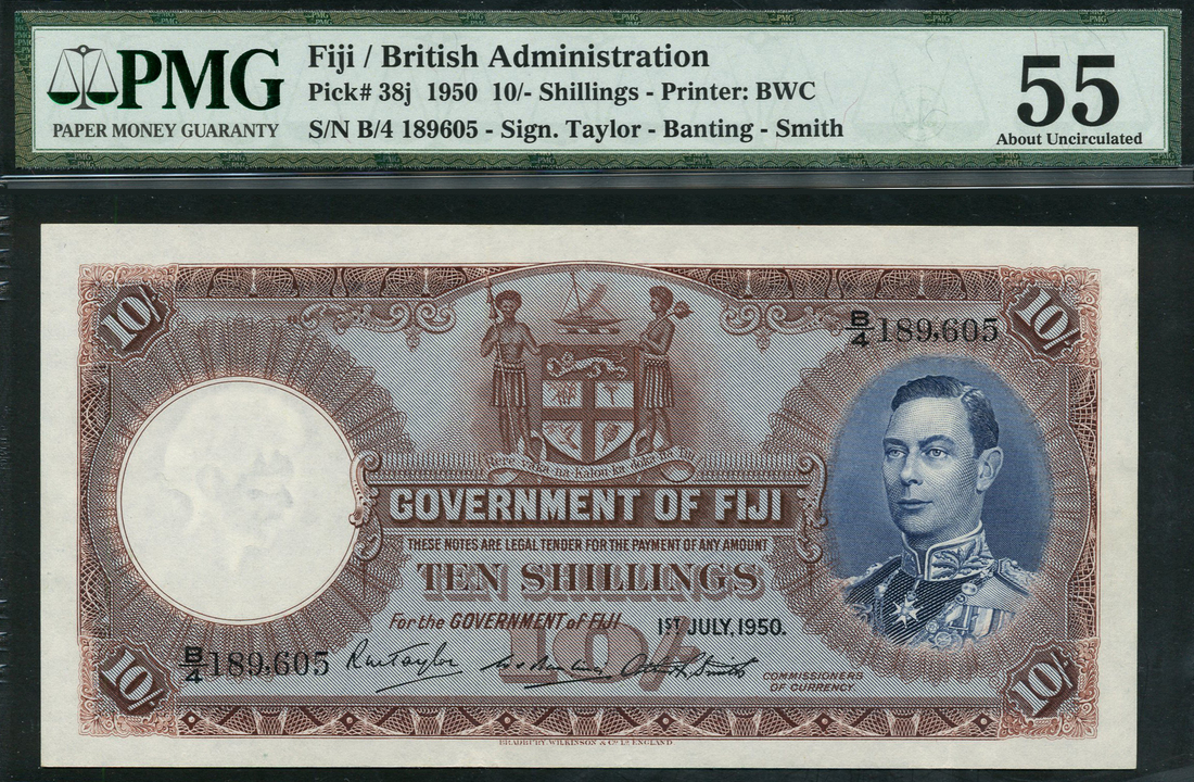 (x) Government of Fiji, 10 shillings, 1 July 1950, serial number B/4 189605, red-brown and blue, George VI at right, arms at top centre, value at low centre and corners, reverse multicolour