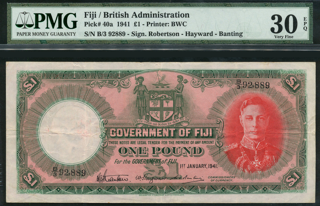 (x) Government of Fiji, £1, 1 January 1941, serial number B/3 92889, green and red, George VI at right, arms at top centre, value at low centre and corners, reverse multicolour