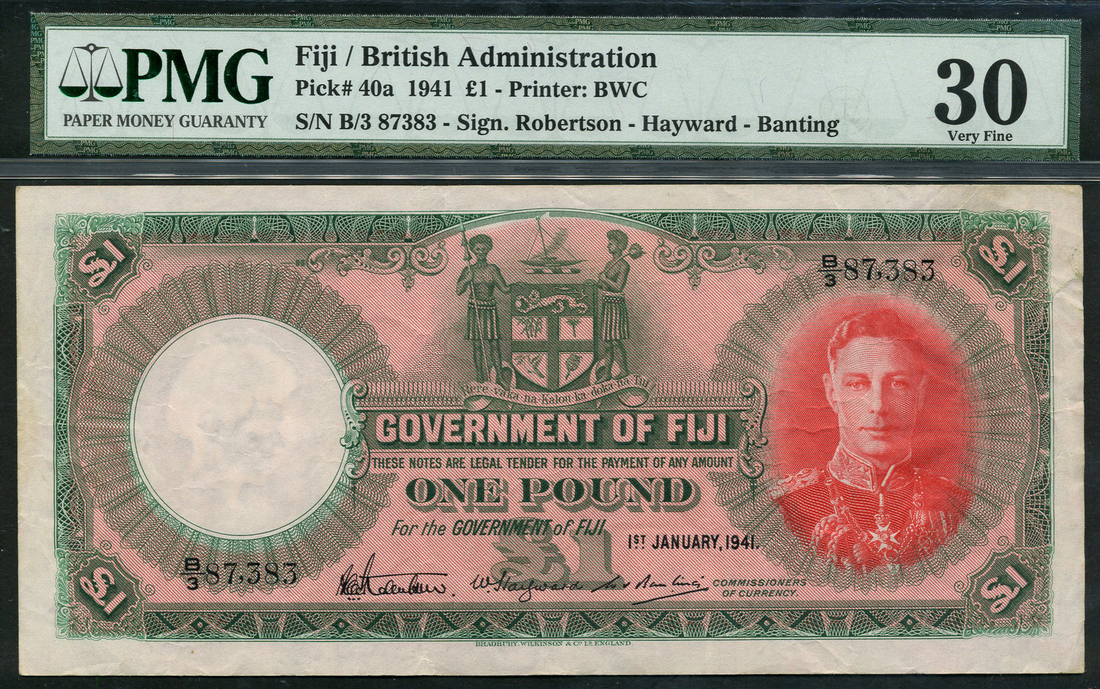 (x) Government of Fiji, £1, 1 January 1941, serial number B/3 87383, green and red, George VI at right, arms at top centre, value at low centre and corners, reverse multicolour