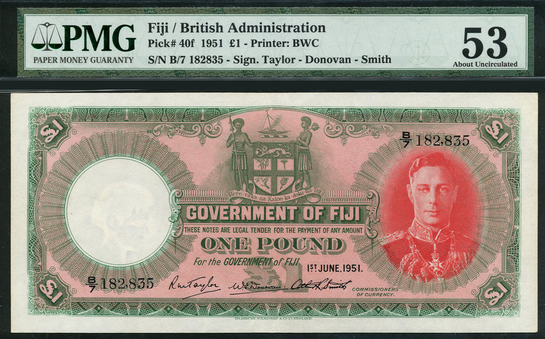 (x) Government of Fiji, £1, 1 June 1951, serial number B/7 182835, green and red, George VI at right, arms at top centre, value at low centre and corners, reverse multicolour