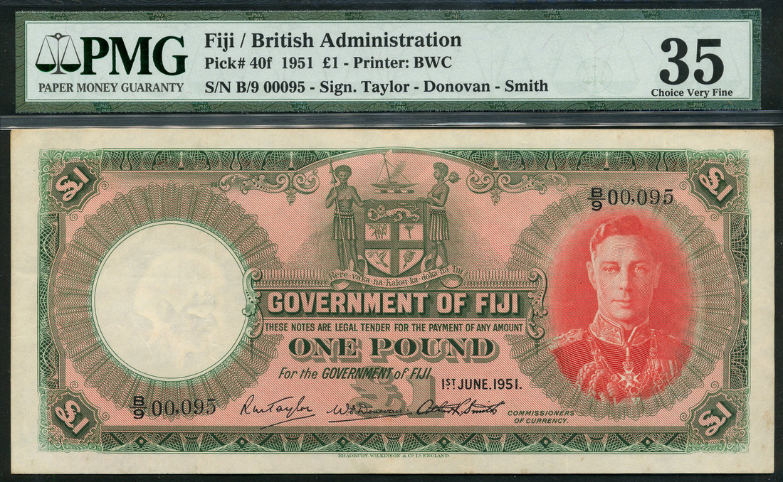 (x) Government of Fiji, £1, 1 June 1951, serial number B/9 00095, green and red, George VI at right, arms at top centre, value at low centre and corners, reverse multicolour