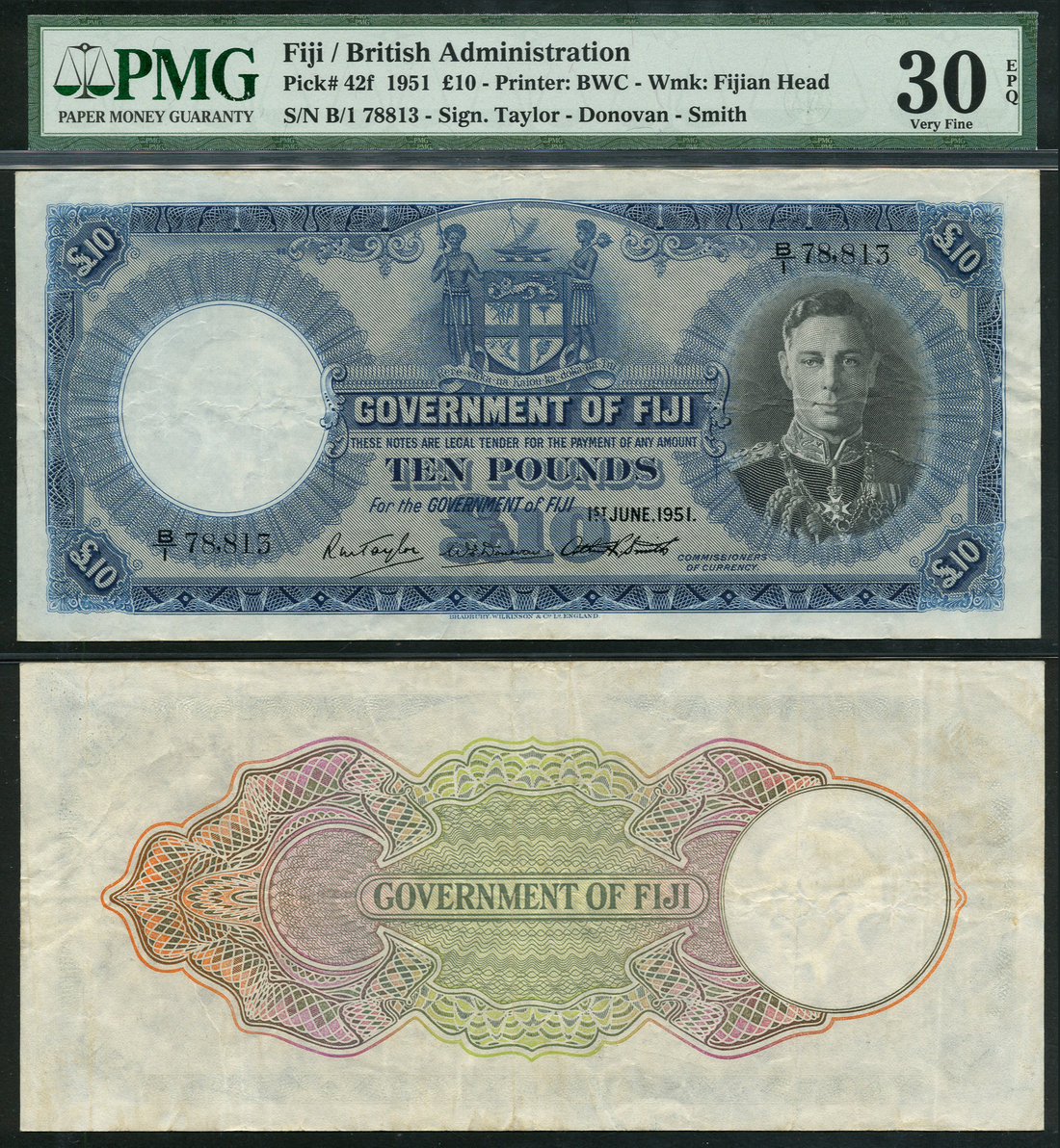 (x) Government of Fiji, £10, 1 June 1951, serial number B/1 78813, blue and black, George VI at right, arms at top centre, value at low centre and corners, reverse multicolour