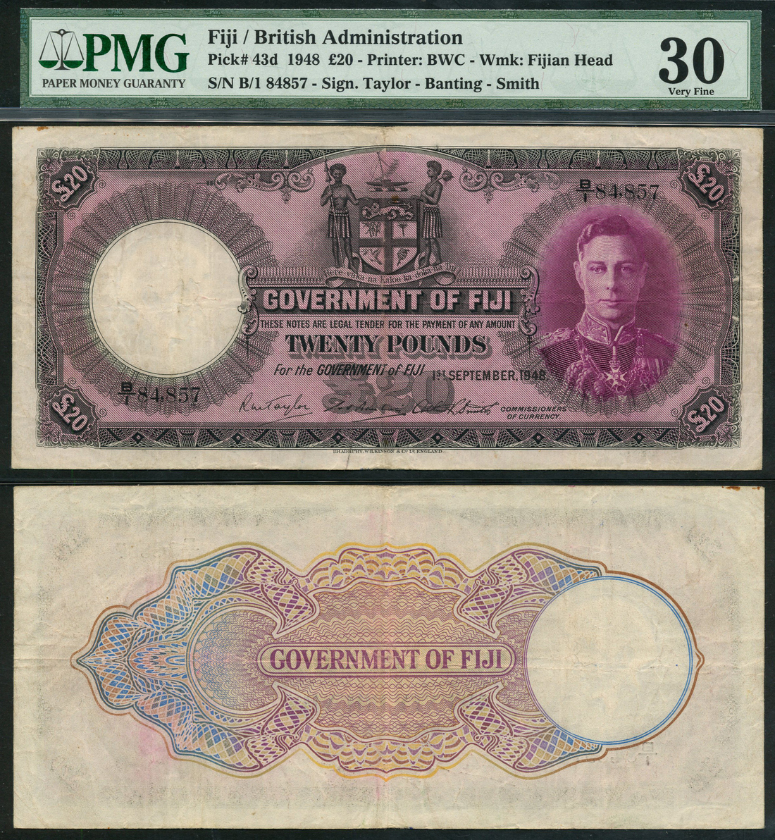 (x) Government of Fiji, £20, 1 September 1948, serial number B/1 84857, black and purple, George VI at right, arms at top centre, value at low centre and corners, reverse multicolour